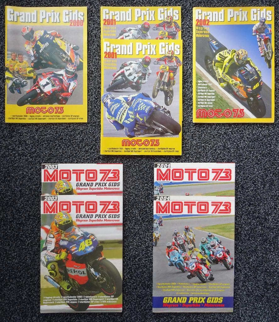 Boekjes (a5-formaat) met alle info over de motor gp''s, uitgegeven door moto73. In totaal 8 boekjes van 5 verschillende jaren: 2000 t/m 2004, 3 jaren 2x. In de boekjes staat info over wegrace, supe
