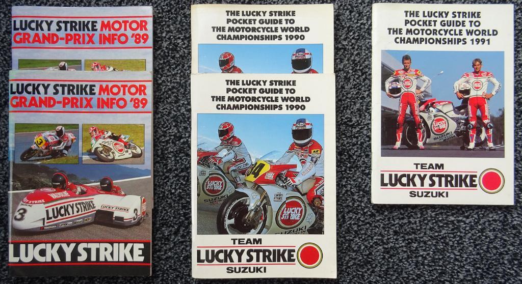 Zakboekjes met alle info over de wegrace motor gp''s, uitgegeven door het lucky strike gp team. In totaal 5 boekjes: 2x 1989 en 1990 en 1x 1991. In de boekjes staat info over het lucky strike team,