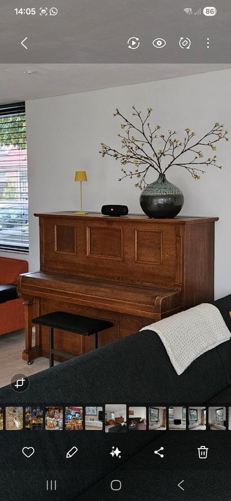 Een grote houten piano uit 1930. Van oorsprong een pianola ( het mechaniek van de pianola is eruit) de piano moet worden gestemd.