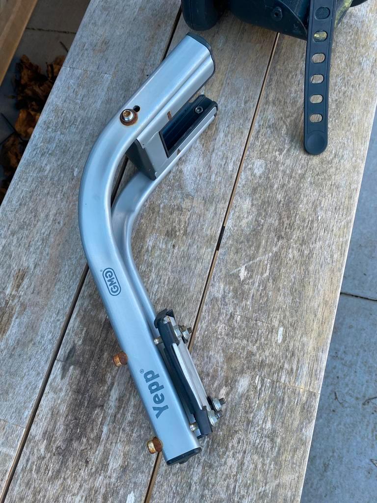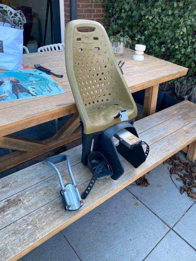 Gratis achterzitje, de bandjes zijn verteerd en scheurden los maar wellicht kan iemand hem nog gebruiken voor onderdelen. Inclusief de houder, ideaal als je al 1 stoeltje heb en 2 fietsen.