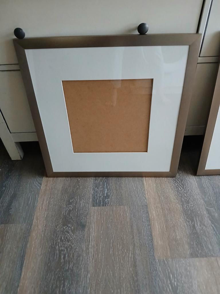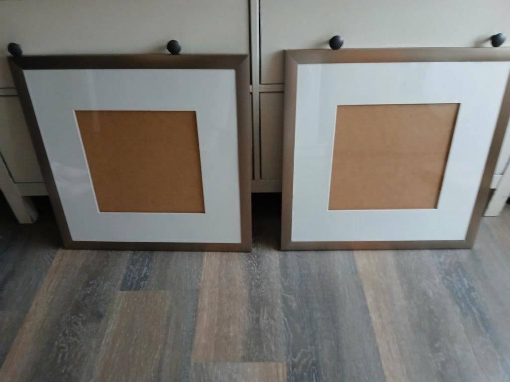 2 mooie geborstelde rvs fotolijsten. Inclusief passe-partout. De lijsten zijn 50 cm bij 50 cm echt glas erin, dus zwaar. Ophalen voor 10 euro samen, 2 stuks.
