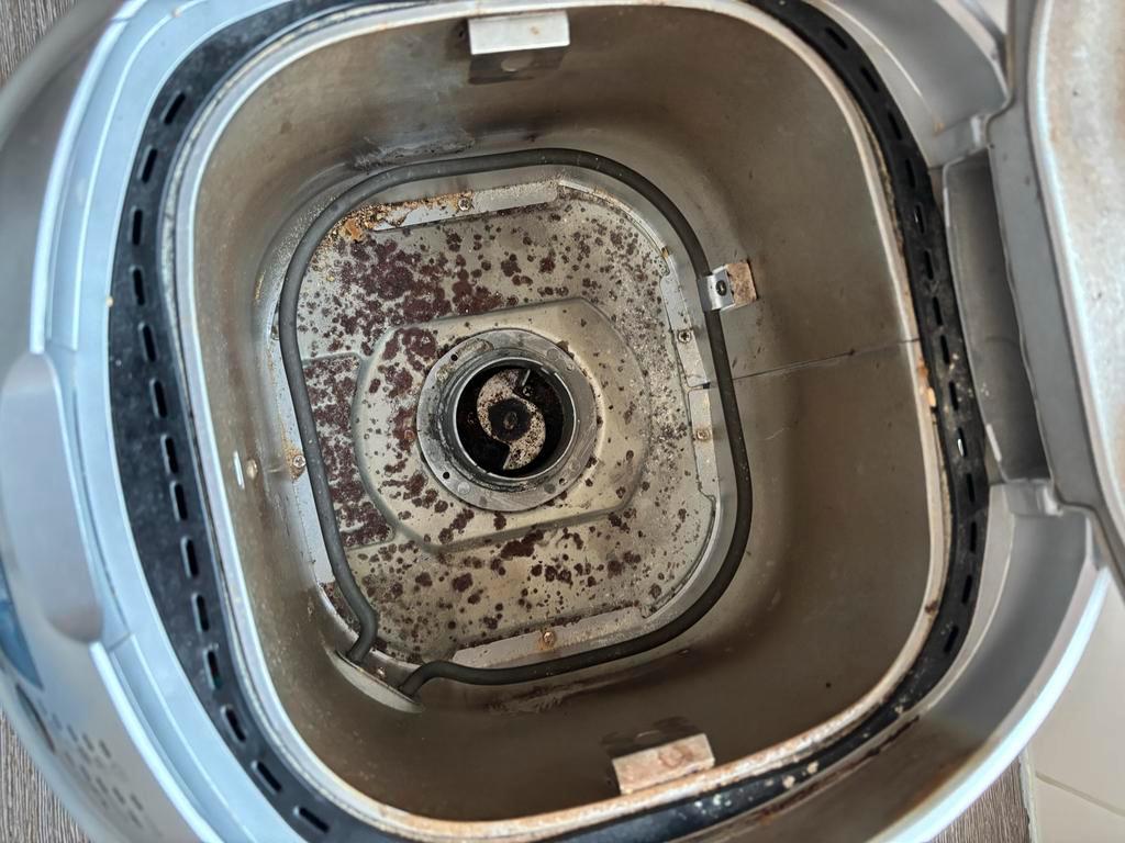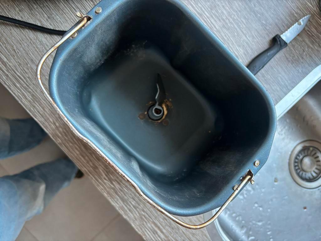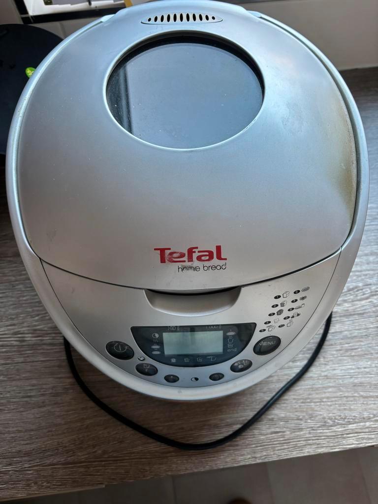 Tefal broodbakmachine met gebruiksaanwijzing. De circlips op de deegkneder zijn kapot, maar de kneder werkt prima als deze in het bakblik zit. De anti-aanbaklaag heeft slijtage sporen (zie foto''s)