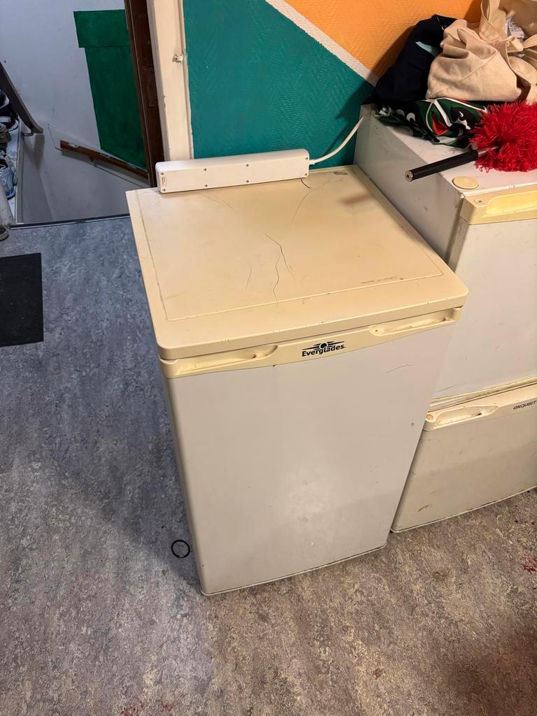 Compacte koelkast, perfect voor een studentenkamer, kantoor of kleine keuken. Werkt naar behoren. Heeft gebruikerssporen. Biedt voldoende ruimte voor de belangrijkste boodschappen. Bekijk de foto''