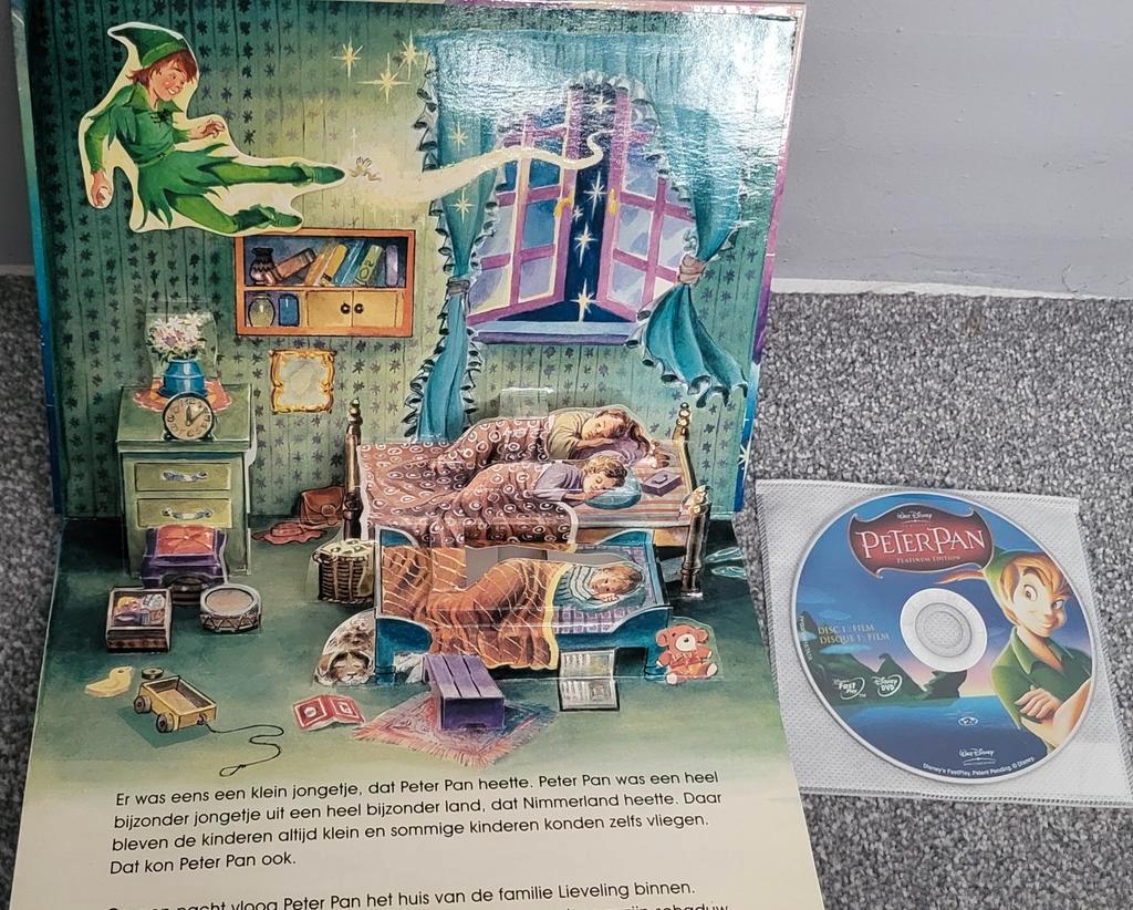 In ruil voor een fles flevosap peter pan film dvd en een prachtig pop-up boek met hardcover. Het boek bevat mooie 3d illustraties die het verhaal tot leven brengen.