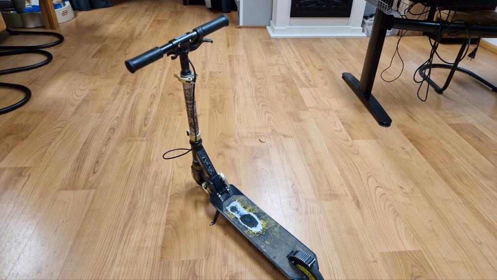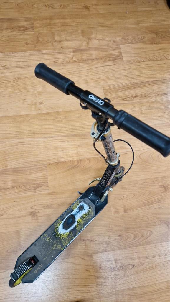 Oxelo step in gebruikte staat. Voorzien van een standaard. Het achterwiel is aan vervanging toe vanwege remslijtage.