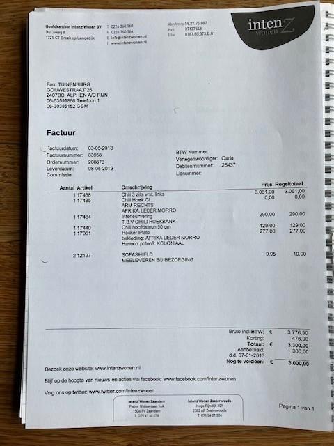 De bank is op 3/5/2013 gekocht bij, intenz in de vestiging zoeterwoude. De bank zit comfortabel en ziet er netjes uit. De bank is gebruikt maar is zonder beschadiging, en het leer is goed onderhouden.