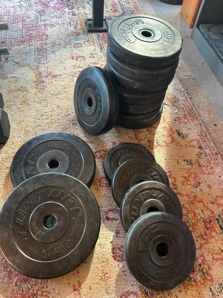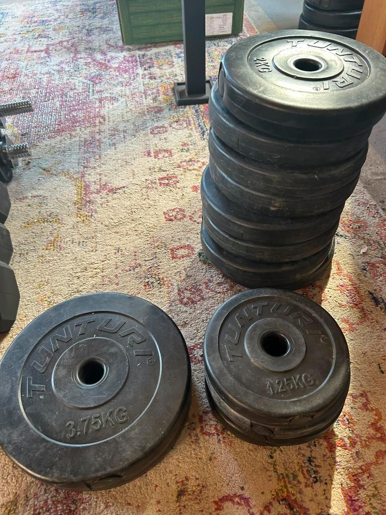 15 voor de standaarden. 15 Voor de gewichten. Samen 25. 15 Voor de standaarden. 15 Voor de gewichten. Samen 25. Er zijn al 2 gewichten van 2 kg weg, verder alles wat op foto’s staat. 5X2 2x3,75 4x1,25