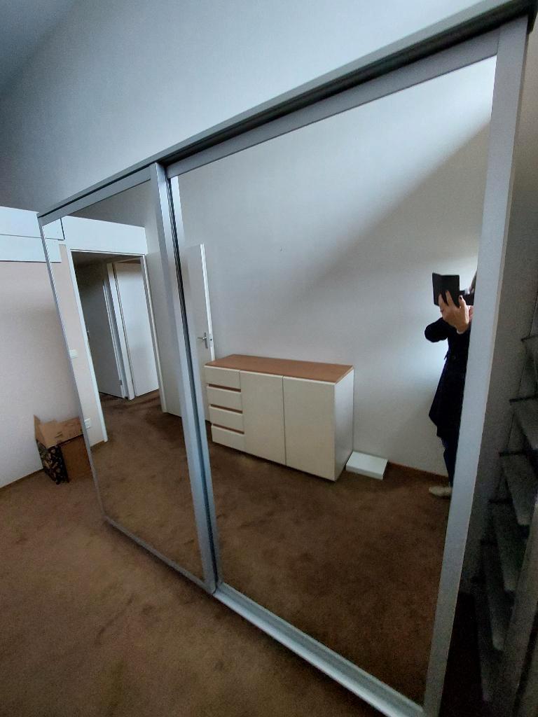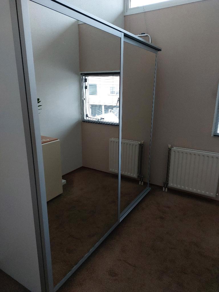 Mooie pax slaapkamerkast met spiegelschuifdeuren, verdeeld over hangdeel met 2 planken boven en onder, legdeel met vier planken. Moet weg vanwege verhuizing. De geïnteresseerde dient de kast te demont