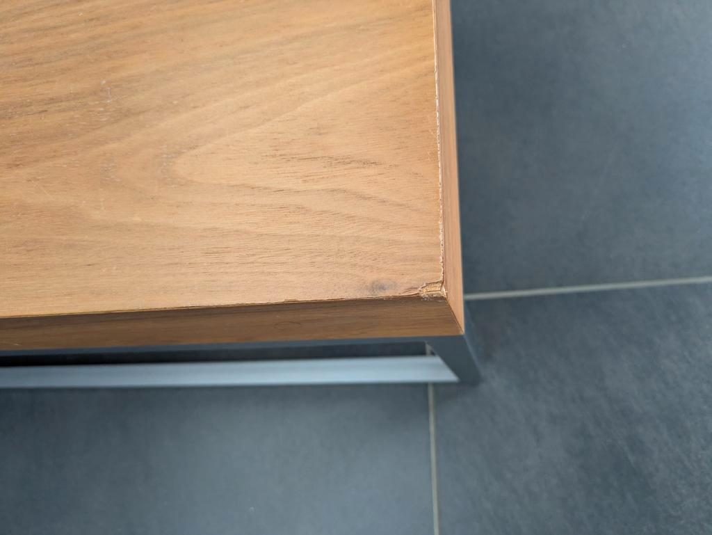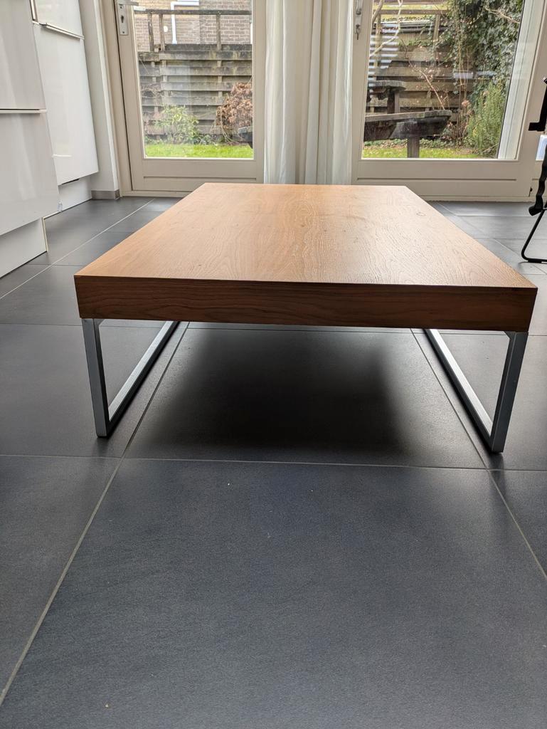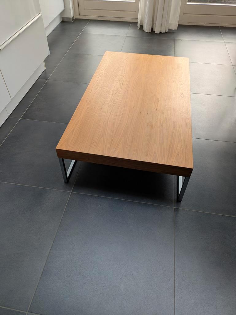 Mooie, stevige houten salontafel met metalen onderstel. 120X 70 cm. Gebruikt, dus heeft ook wat beschadigingen op de hoekjes en wat krassen op het blad. Niet massief hout, maar eikenhouten plaat.