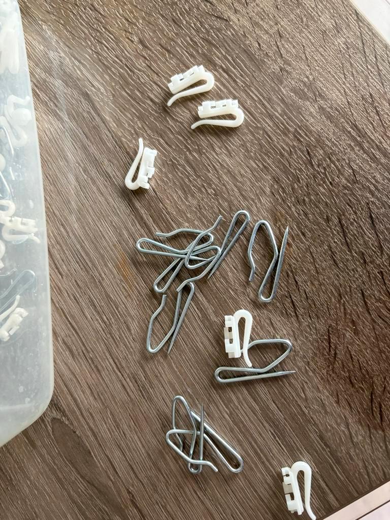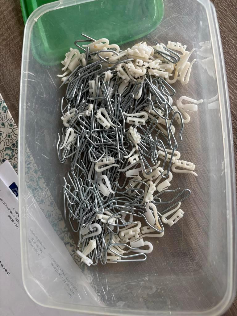Een verzameling gordijnhaken, zowel van metaal als plastic. Geschikt voor verschillende soorten gordijnen. In goede staat.