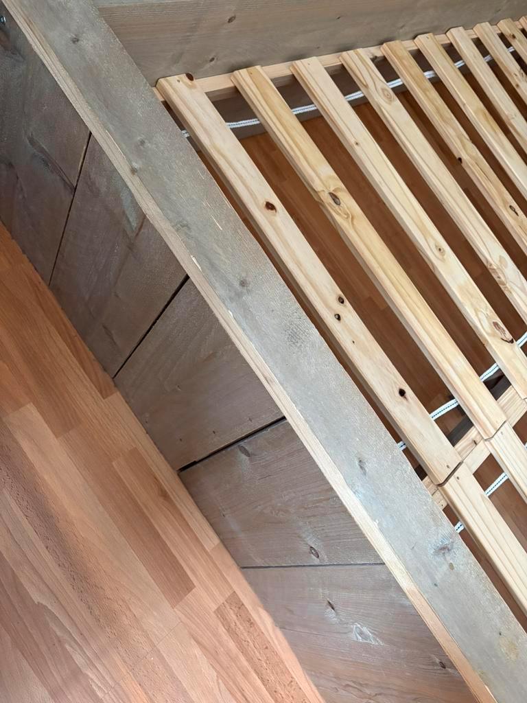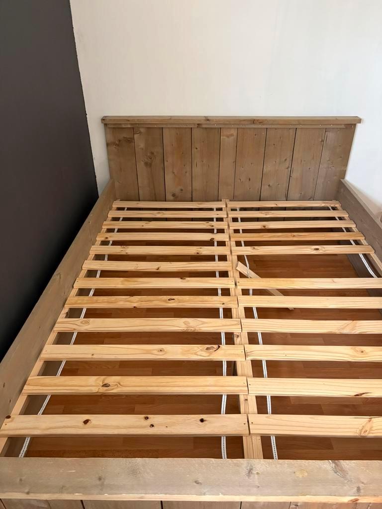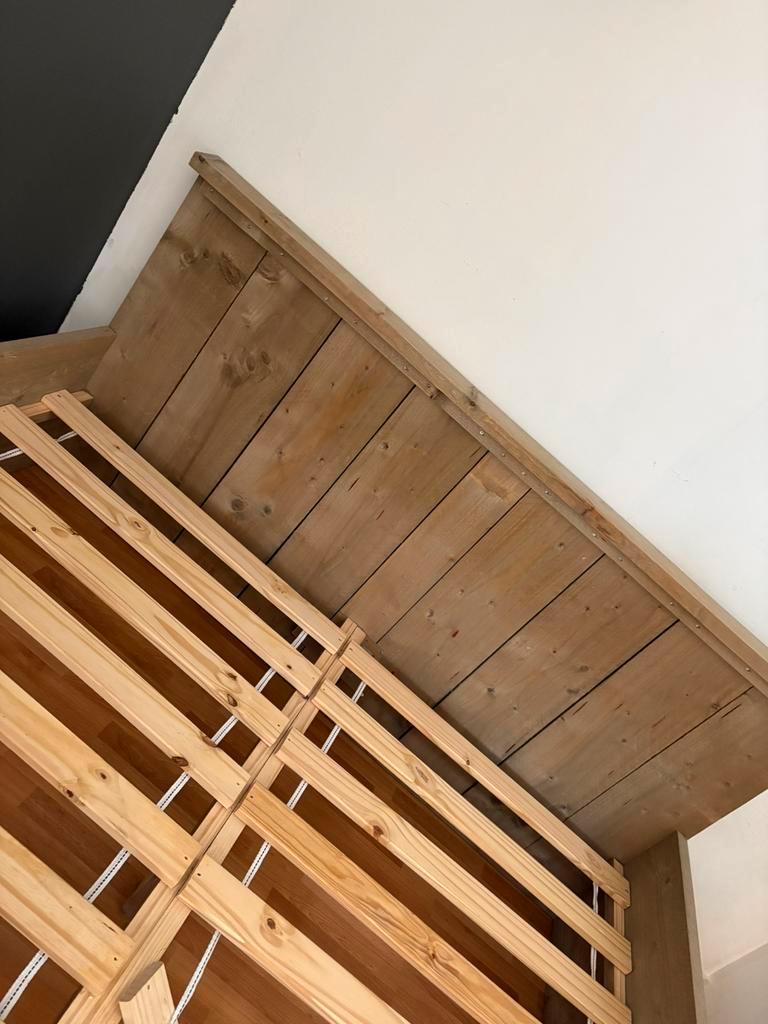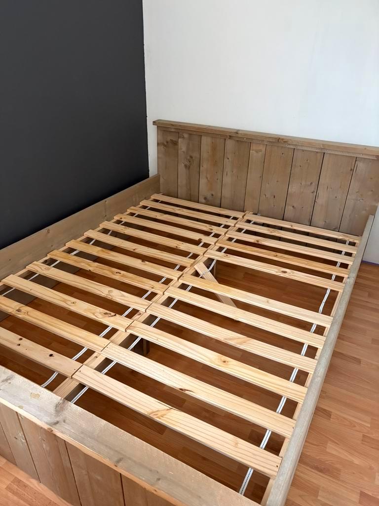 Steigerhouten bed 2 personen, dit bed heb ik laten maken voor mijn zoon. Nu hij samen is gaan wonen mag deze weg, het bed is al uit elkaar gehaald. Afmeting zijn: hoogte hoofdstuk 80 cm hoogte voetstu