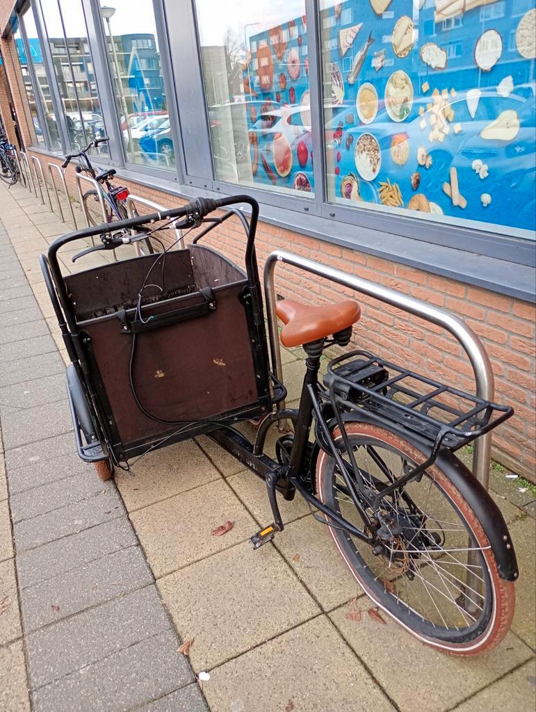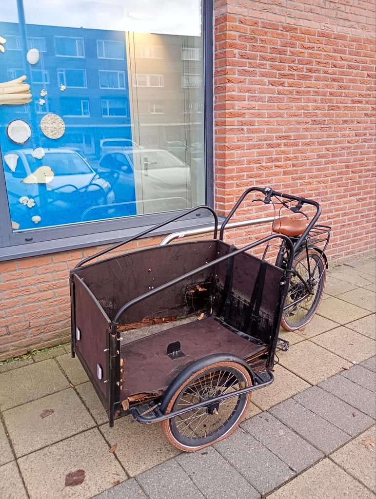 Transportfiets staat voor de ah op de molenweg nijmegen. Met 2 kapotte banden, misschien iets voor een hobbyist ? Op slot, maar ah is blij als die weg is. Aan de overkant, tussen 2 flat gebouwen een g