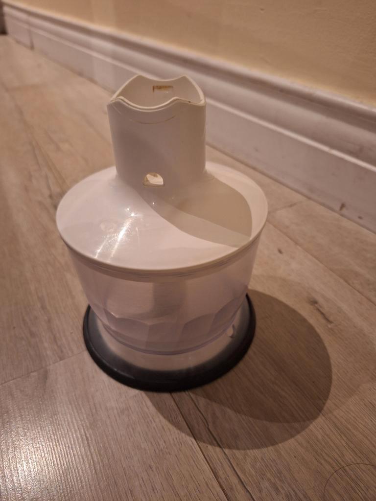 Het zwarte rubber is een beetje viezig en vettig en de bovenkant van het mes zit los, maar hij werkt verder nog prima. Ik doe hem weg, omdat ik er nu twee heb. Inhoud 1l.