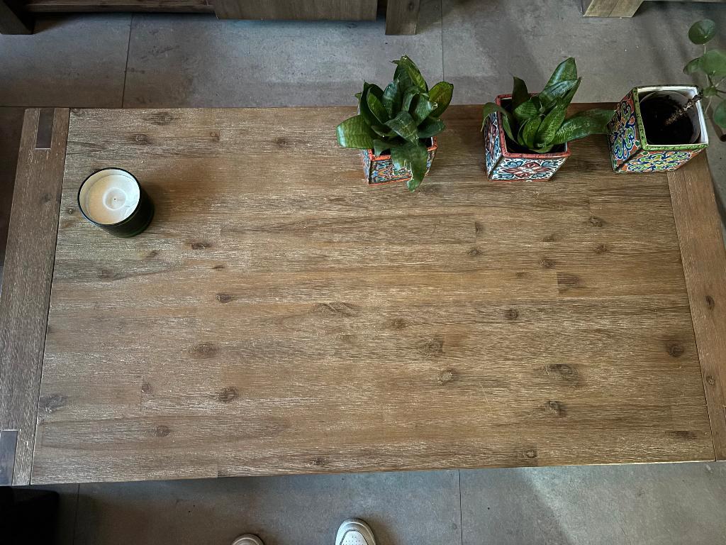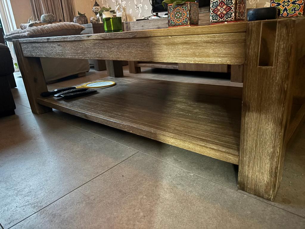 Salontafel van de salzburg selectie van pronto van acaciahout. Deze tafel heeft wat gebruikerssporen maar kan prima nog een ronde mee. Afmetingen zijn 135x70x42 cm (lxbxh). Bijpassende tv-meubel is oo