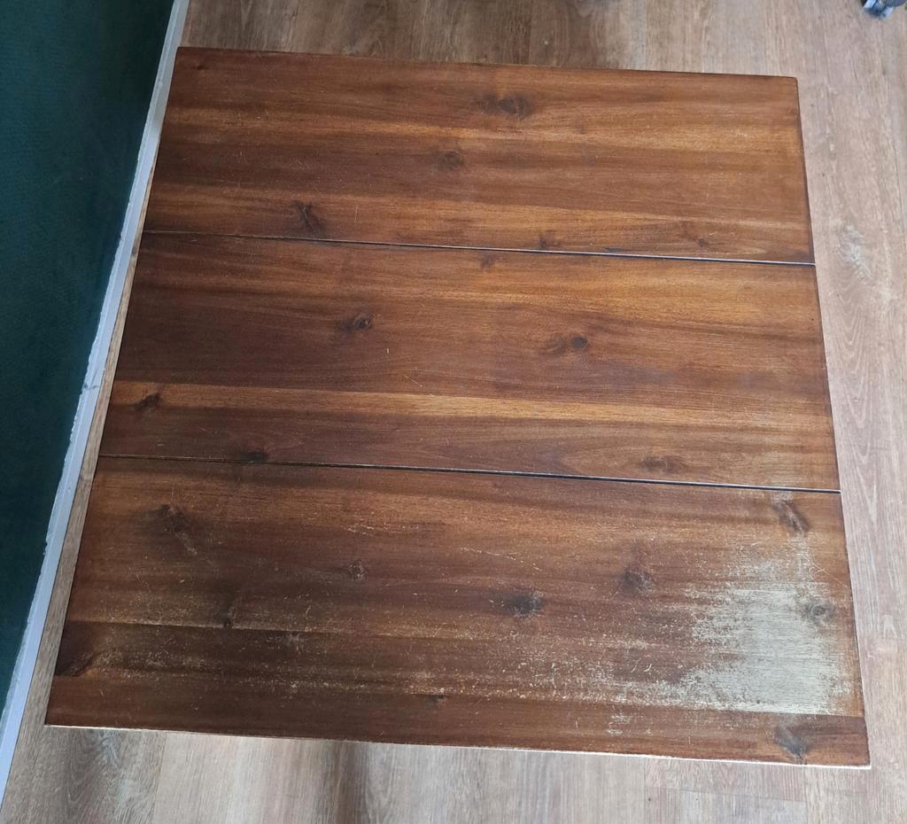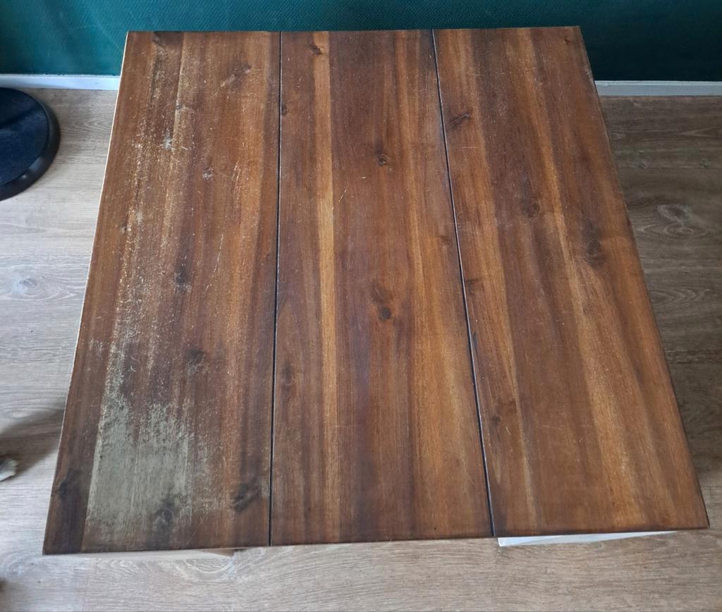 Zware houten salontafel. Veel gebruikssporen maar wel zeer stevig. Ziet er waarschijnlijk na een likje verf weer goed uit. Bovenblad is donker/warm bruin, poten licht. Afmetingen 70x70x40 cm. Gratis a