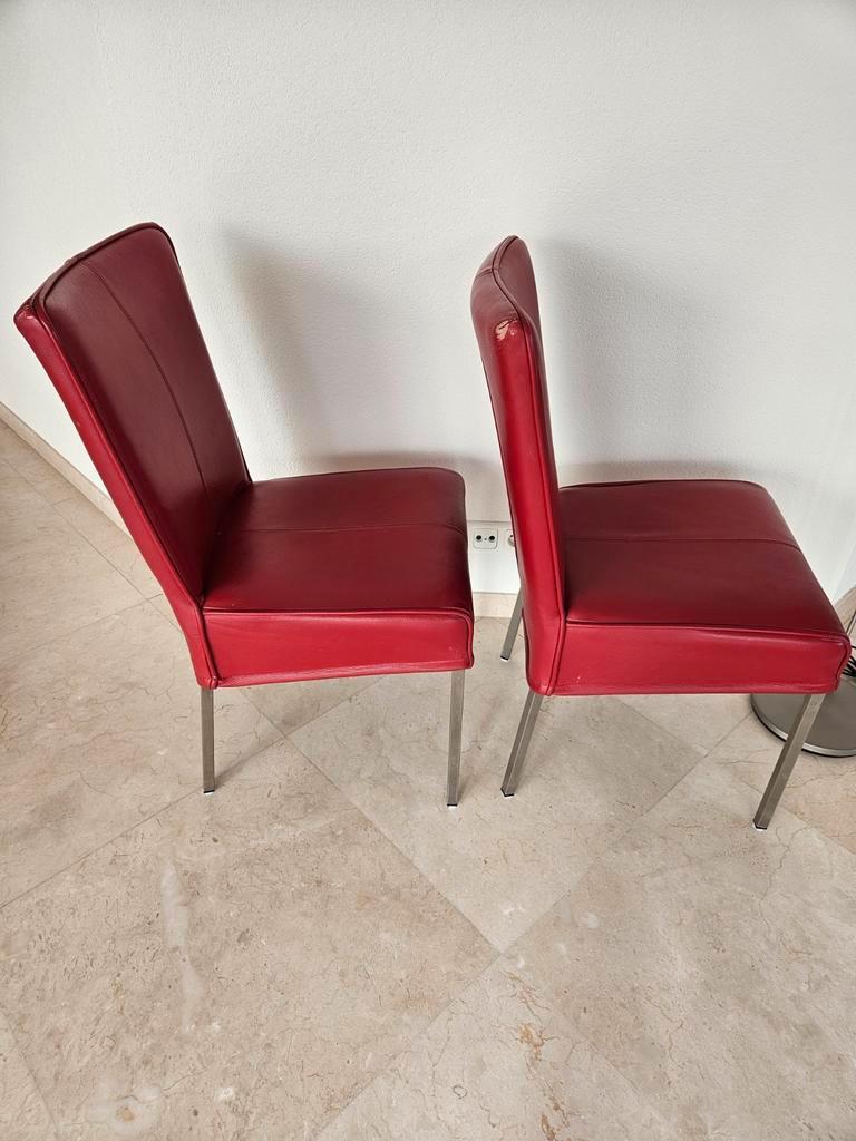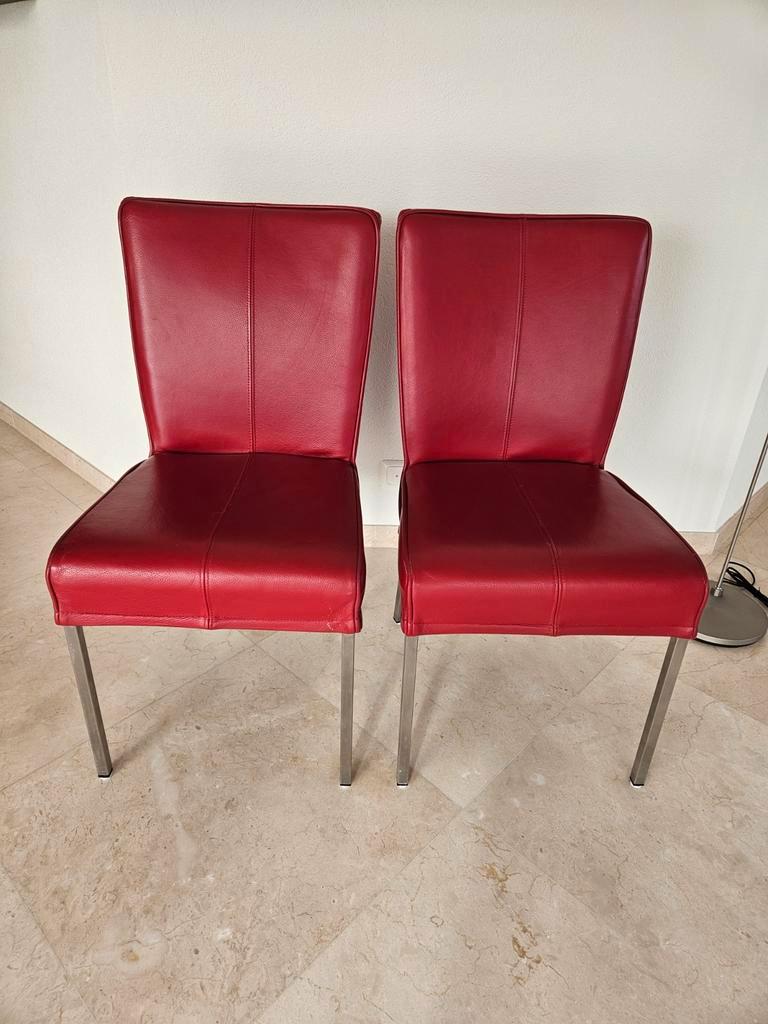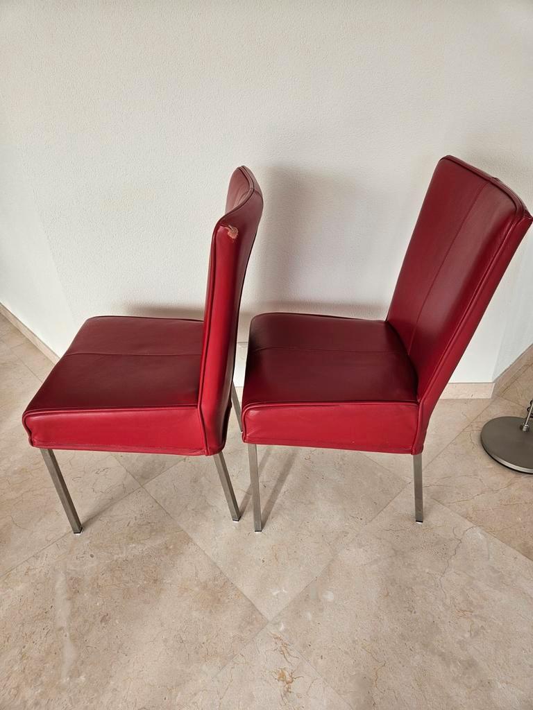 Set van 2 leren eetkamerstoelen. De stoelen zijn op de hoeken aan de bovenkant van de rug beschadigd door het schuren langs de muur. Verder nog in goede staat.