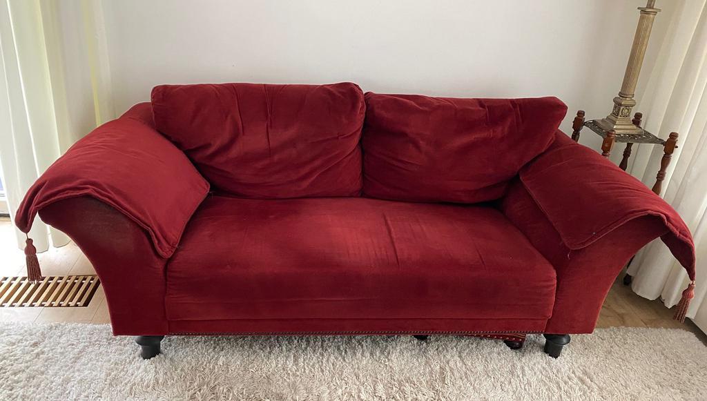 Leuke nostalgische rode bank met losse zitkussens in goed staat gratis ophalen