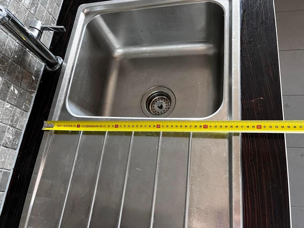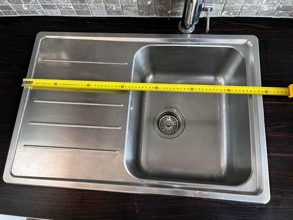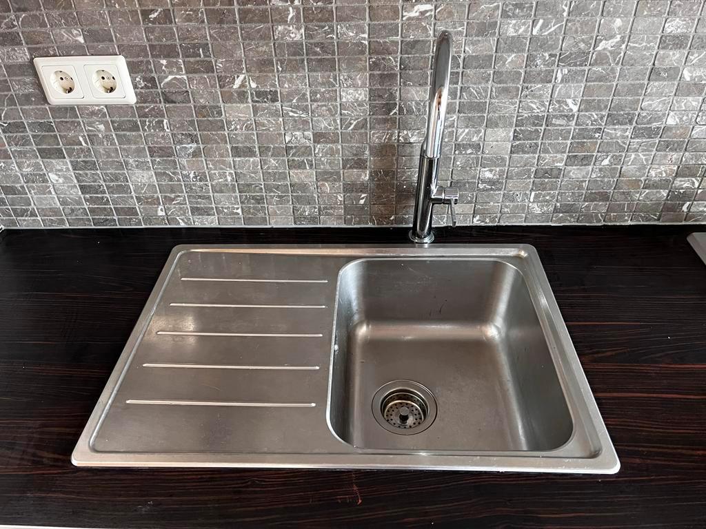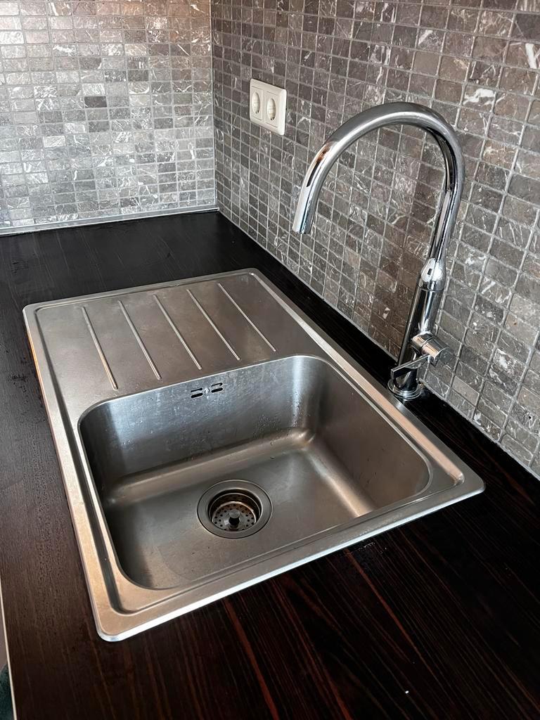 Nette rvs spoelbak met mengkraan uit bestaande keuken, beschikbaar wegens keukenvervanging. Functioneert goed en ziet er netjes uit met normale gebruikssporen. • breedte: 69 cm • diepte: 47c