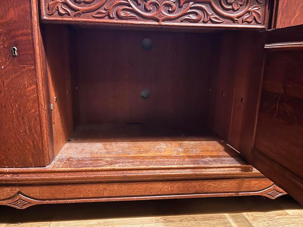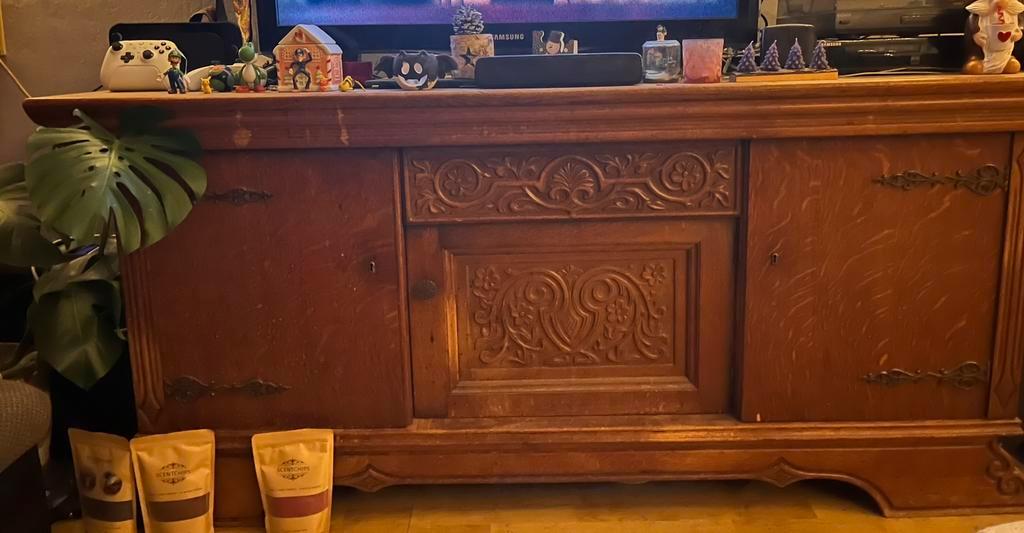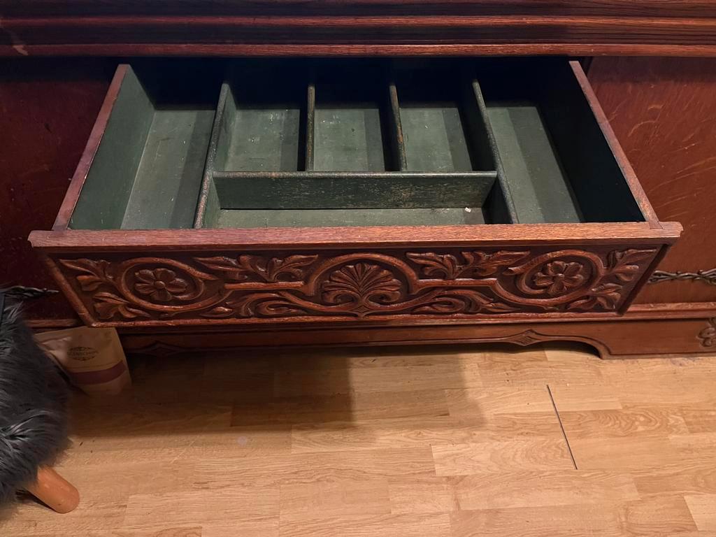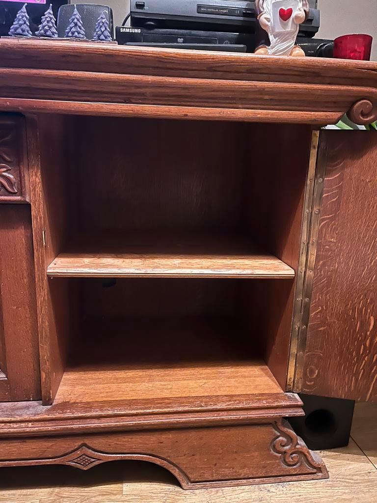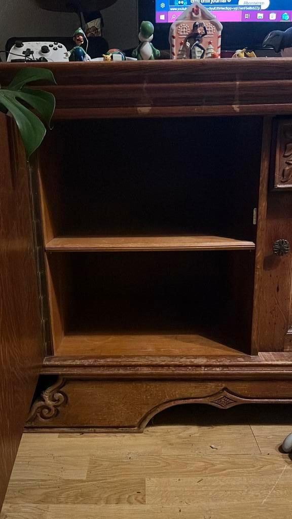 Prachtig zwaar antiek dressoir! Massief hout met houtsnijwerk. Heeft zeker wat ouderdoms gebreken maar super gaaf om een beetje op te knappen en weer te gebruiken. Heeft veel opbergruimte met werkende