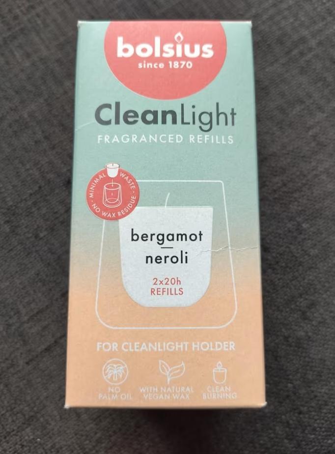 Nieuwe bolsius cleanlight refill verpakking met de geur bergamot neroli. Bevat 2 refills van 20 uur. Let op: zonder houder, dus alleen geschikt als je al een cleanlight houder hebt. Gratis af te halen