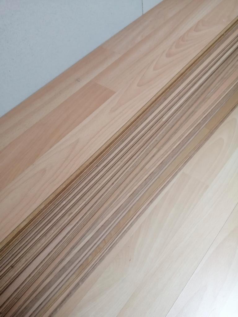 Een restant gebruikt kliklaminaat, 26 stuks van 138 x 19,5 cm.