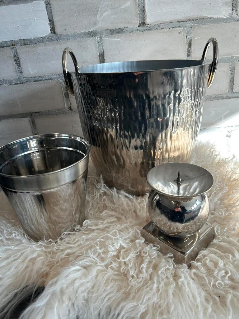 Heel mooi set zo bij mekaar zie foto’s zonder de decoratie !..3 Delig mooi ook in eric kuster inrichting of hotel sjiek vaas kan ook als wijnkoeler gebruikt worden er passen 3 flessen in .