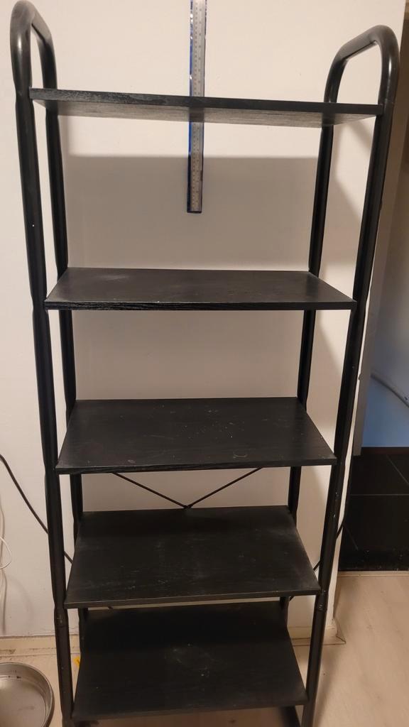 Een nette zwarte metalen stellingkast met 4 planken. Ideaal voor opslag in de garage, berging of woonkamer. De kast is in gebruikte staat, maar nog stevig en functioneel. Afmetingen: 62x35x180. Helema