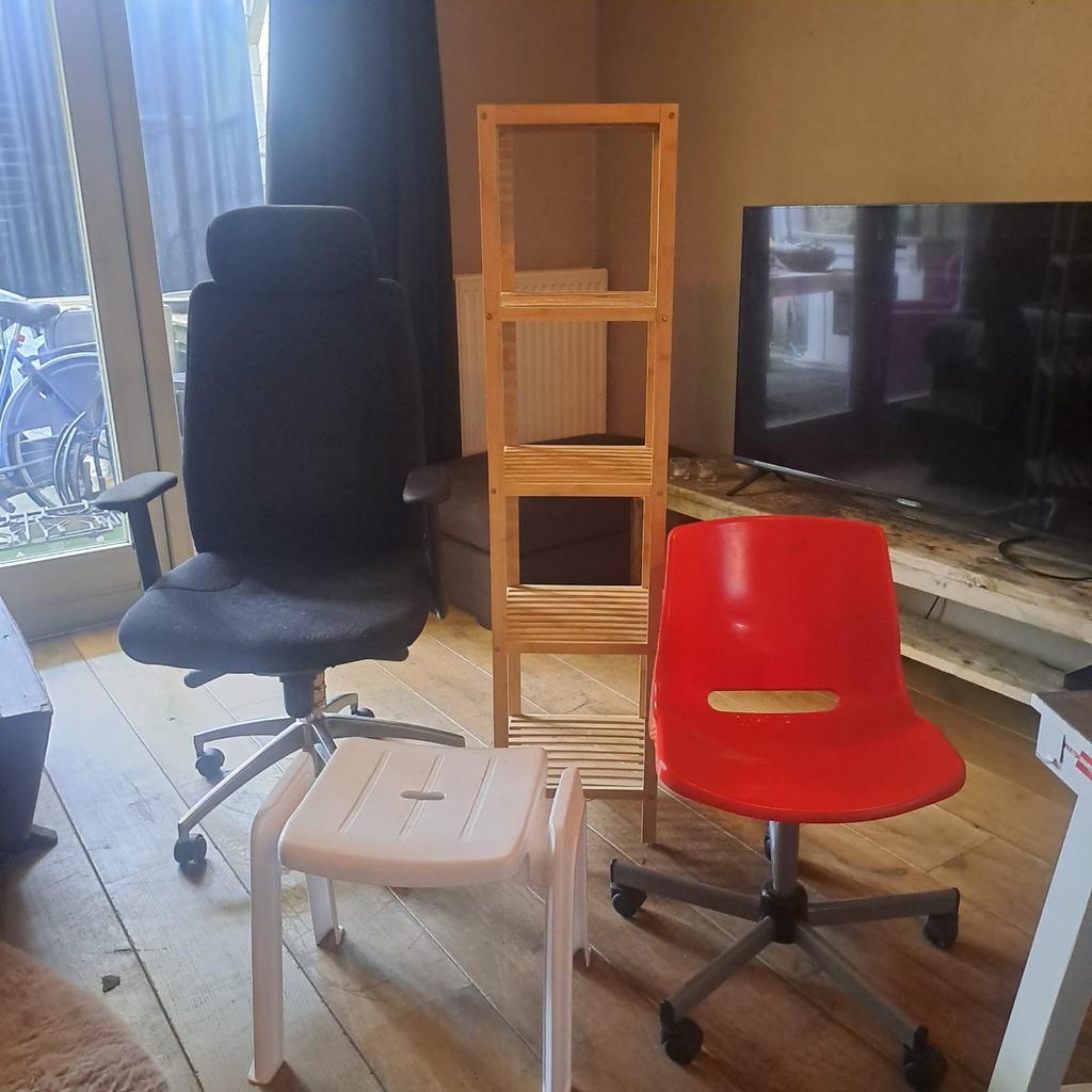 Gratis af te halen! Vandaag nog! Complete set bestaande uit een bureau, bureaustoel, krukje en een doucherek. Ideaal voor studenten of als tijdelijke inrichting.