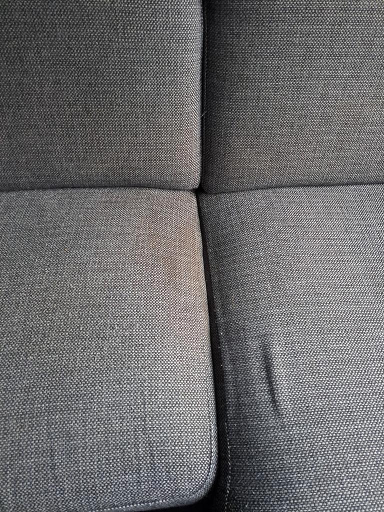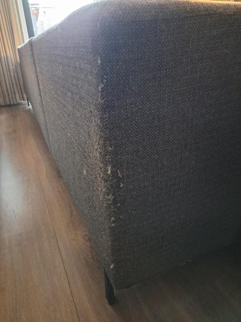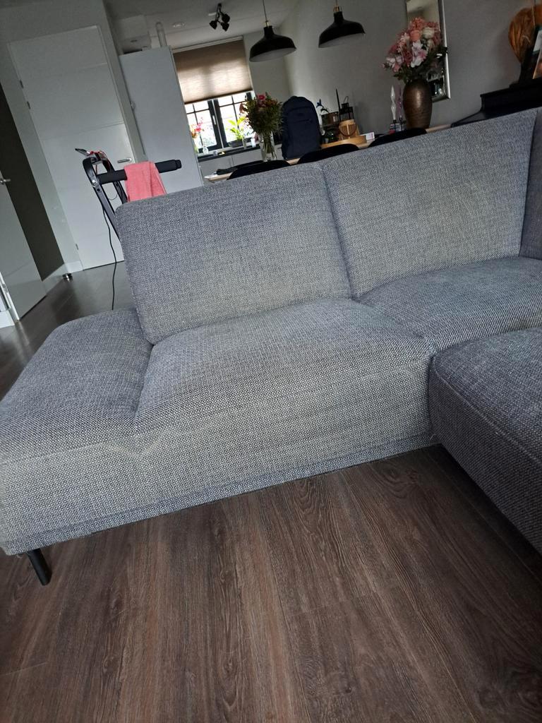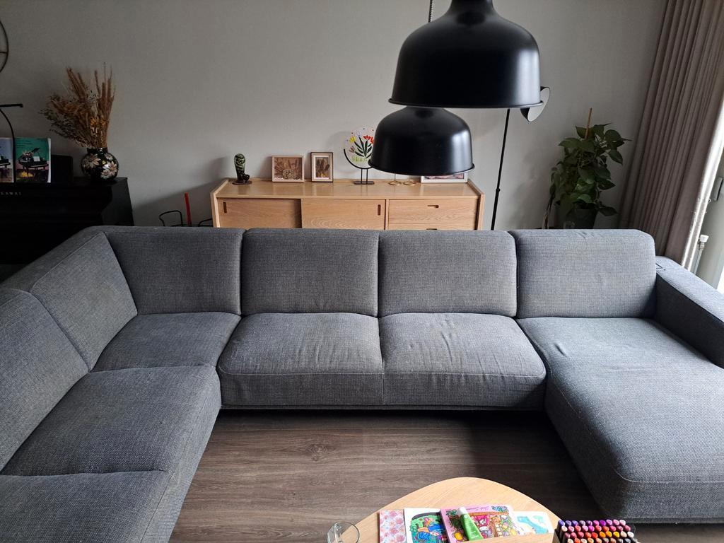 Ruime hoekbank (u bank) in gebruikte staat. Biedt plaats aan veel personen. De bank is bekleed met een grijze stof. Er zitten vlekken op, en katten krabben. Huisdieren dus in huis. Zie foto''s. Daa