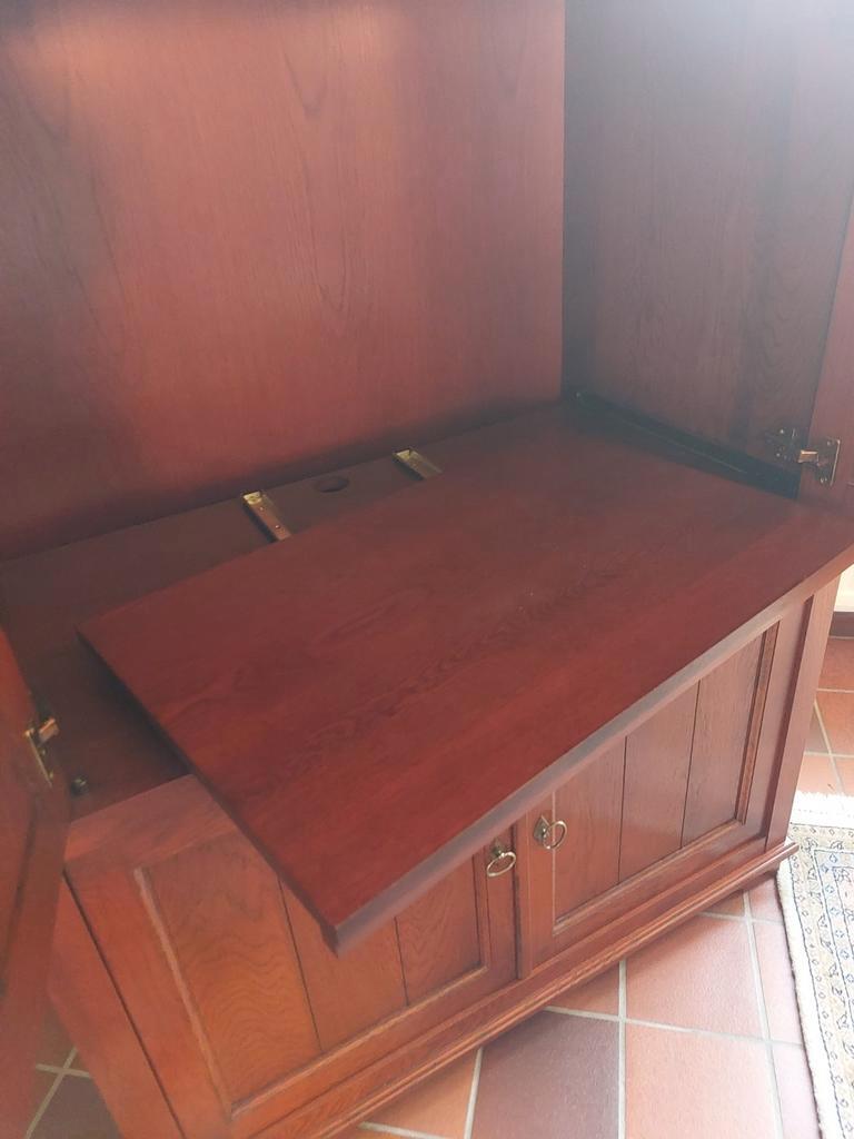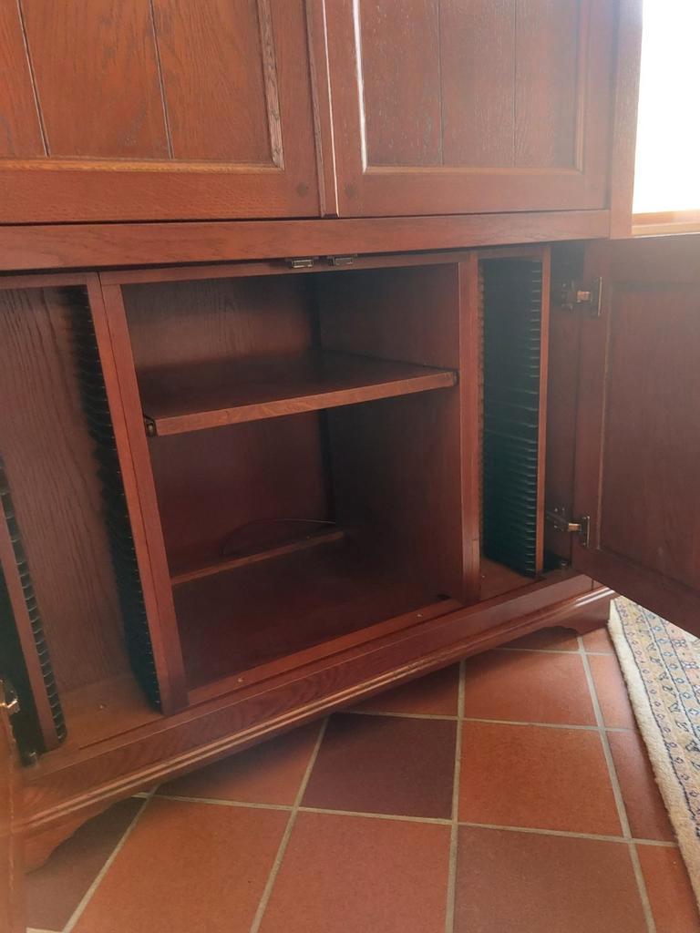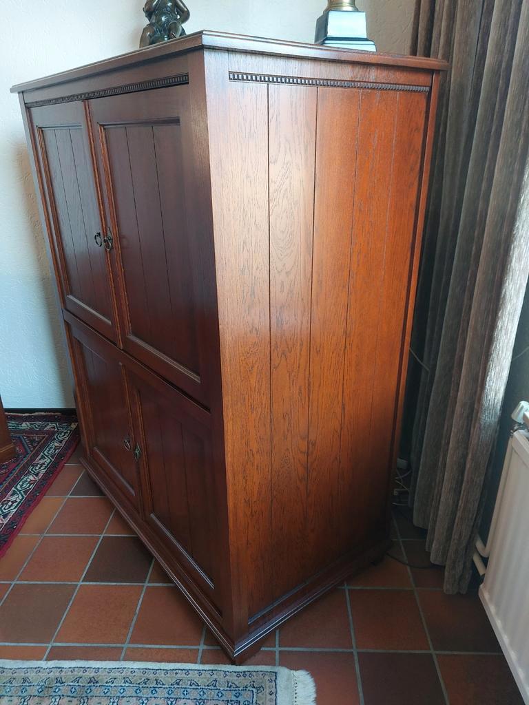 Mooie degelijke tv kast in zeer goede staat. Is voorzien van een uitschuifbaar draaiplateau de hoogte is 140cm, breedte is 110cm de diepte is 60cm