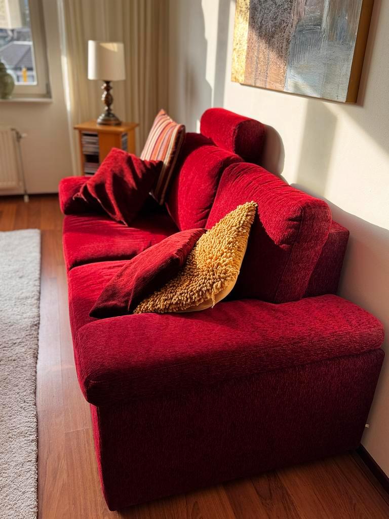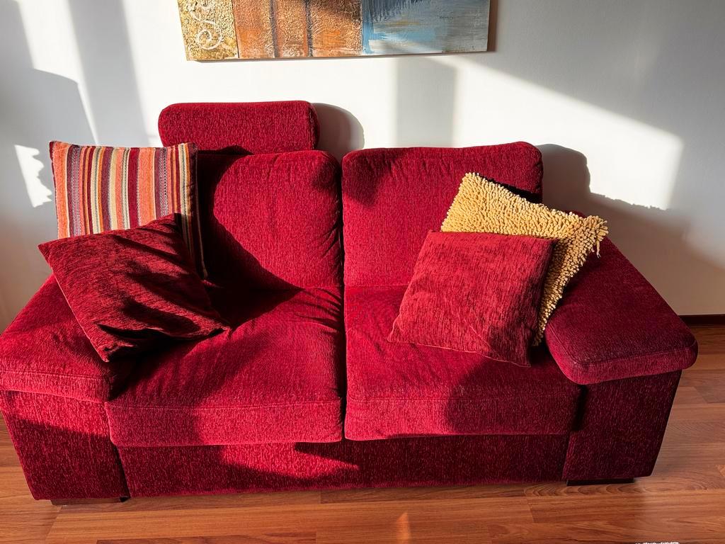 Gratis lift aanwezig dus geen gesjouw over de trap! Comfortabele rode 2 of 2.5-Zits bank bekleed met zachte stof. De bank is 187 cm breed, 90 cm diep en 100 cm hoog. Perfect voor een gezellige zithoek