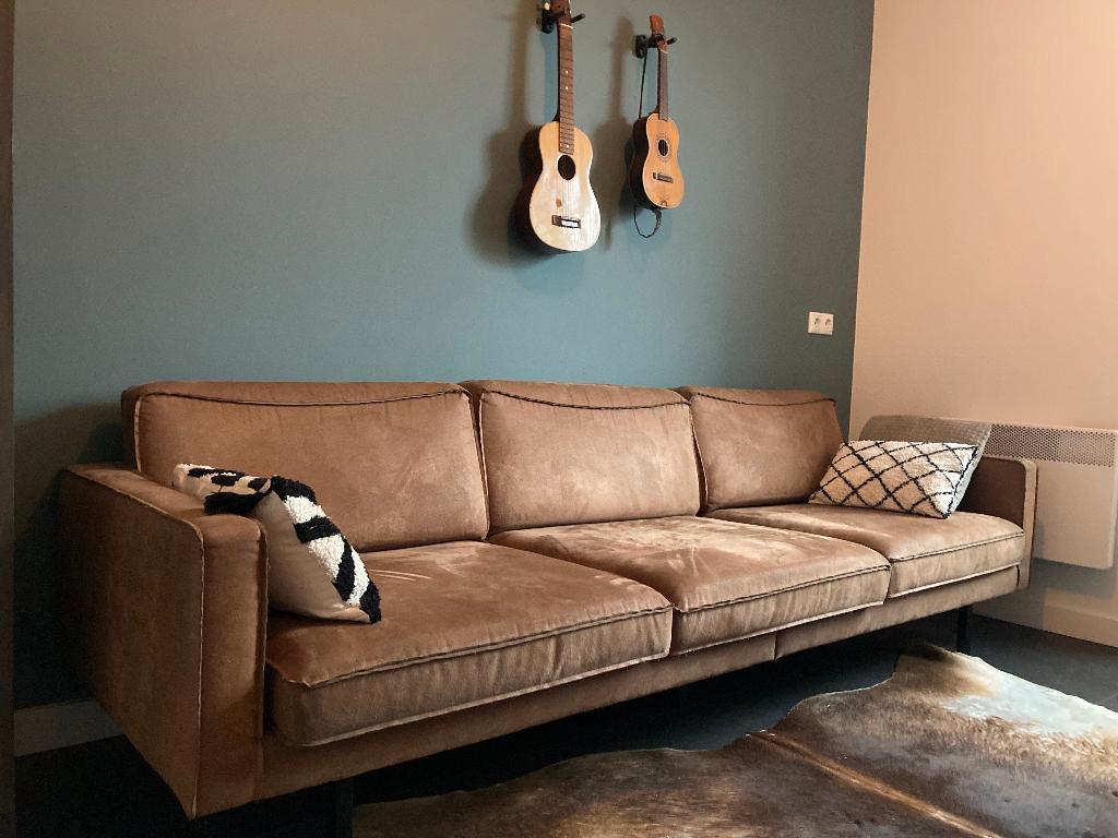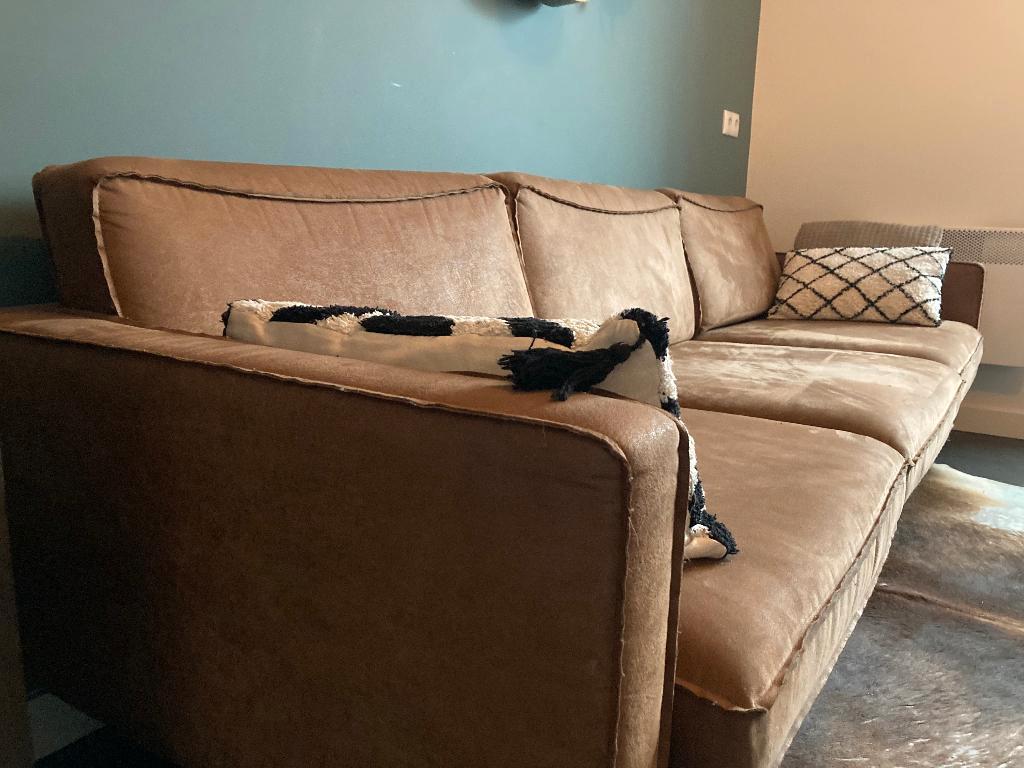 Mooi suede 3 zits bank ewelke past in ieder interieur. Zit heerlijk en is in uitstekende staat. De kussens zijn los en makkelijk verwisselbaar. De afmetingen zijn: lengte : 262 cm diepte : 90 cm hoogt