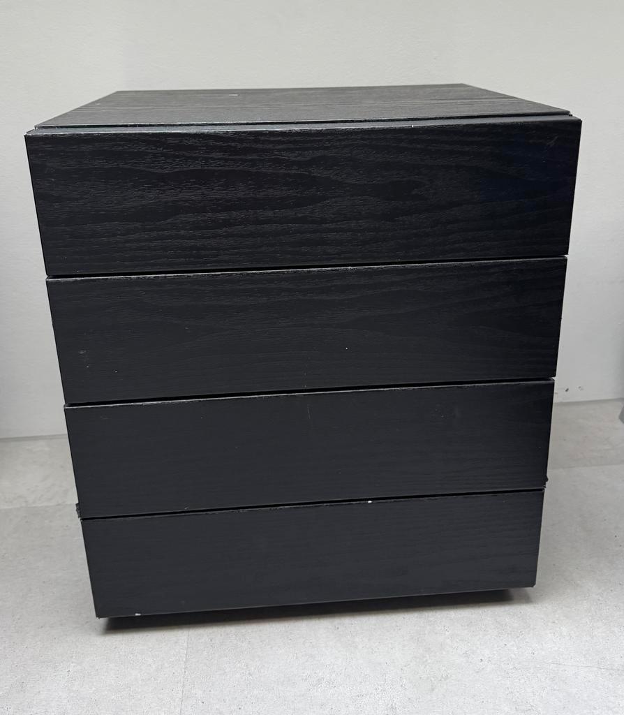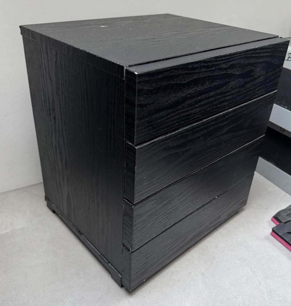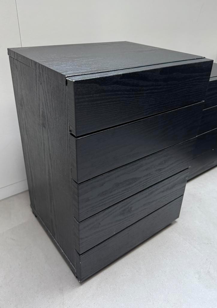 2 nachtkastjes met zwarte wrapfolie (ondergrond is hoogglans wit) hoogte 58cm, breedte 42cm, diepte 36,5cm hoogte 47cm, breedte 42cm, diepte 36,5cm