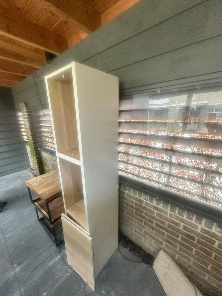 Besta kast, geverfd in beige kleur zoals te zien hier en daar verflaag eraf. 2 Deurtjes nog aanwezig, geen scharnieren. De kast is in gebruikte staat, maar nog steeds functioneel en klaar voor een twe