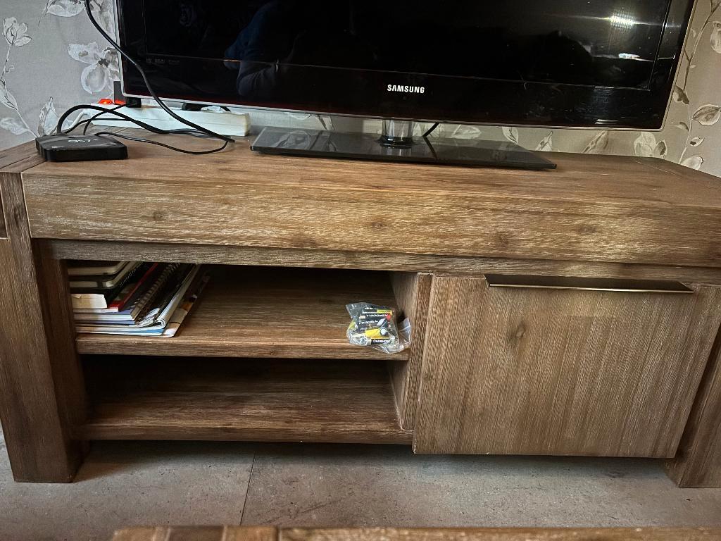 Tv-meubel van de salzburg selectie van pronto van acaciahout. Meubel heeft heeft wat gebruikerssporen maar kan prima nog een ronde mee. Afmetingen zijn 120x45x50 cm (lxbxh). Bijpassende salontafel is