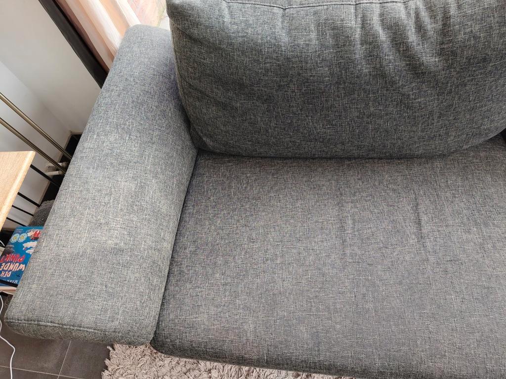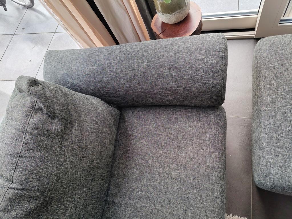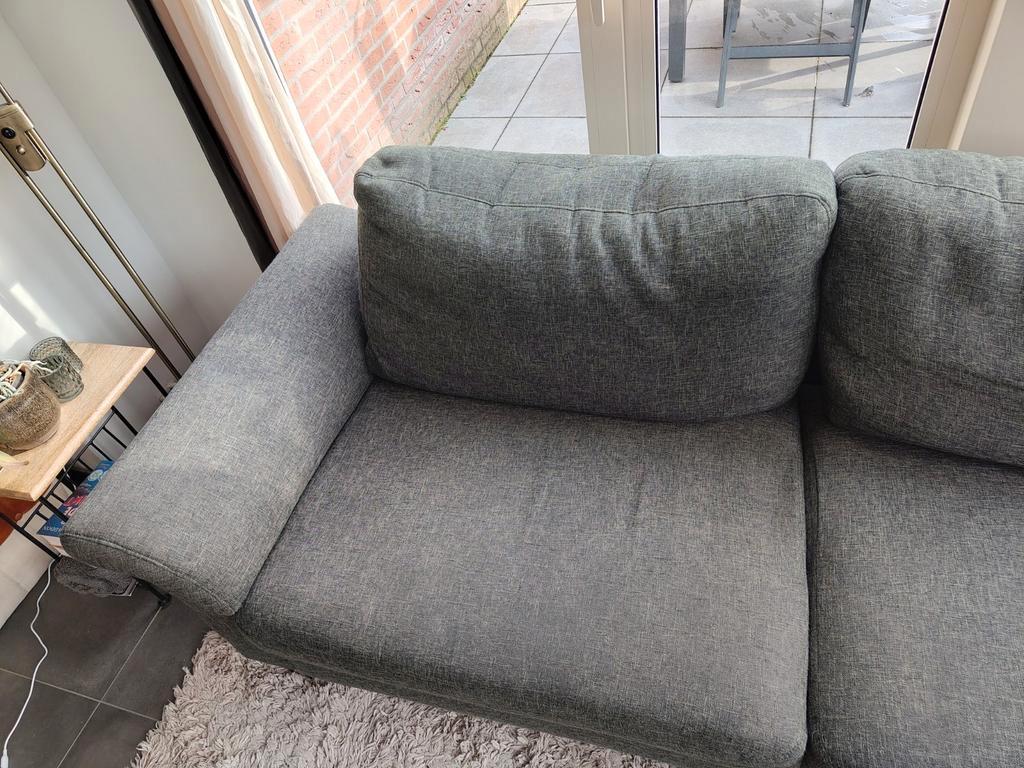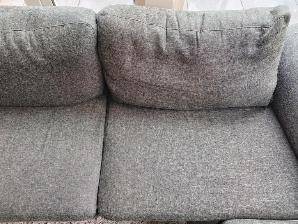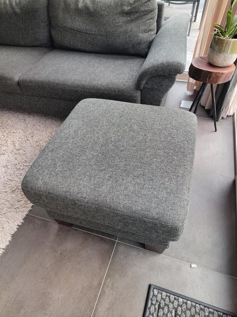 Comfortabele bank met een hocker. De bank is bekleed met een mooie, kwalitatieve stof. Afmetingen van de bank zijn 225 cm breed en 90 cm diep. Zitgedeelte op 40 cm hoogte, ongeveer 55cm diep. Afmeting