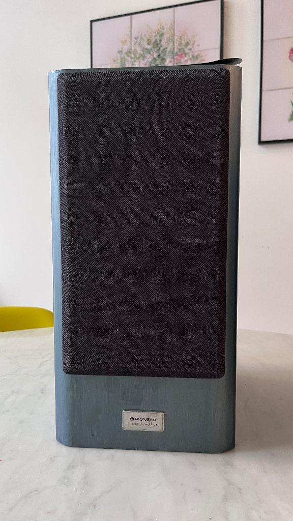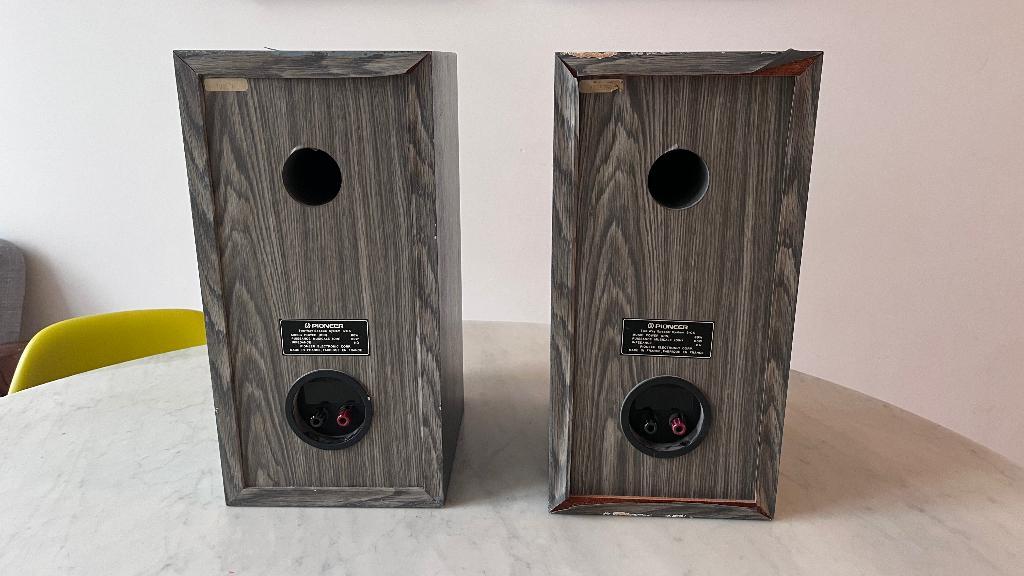 Deze pioneer luidsprekers zijn uit de jaren ''90. De geluidskwaliteit is heel goed. 80W. Ze zijn geschilderd, de fineer laat wat los.