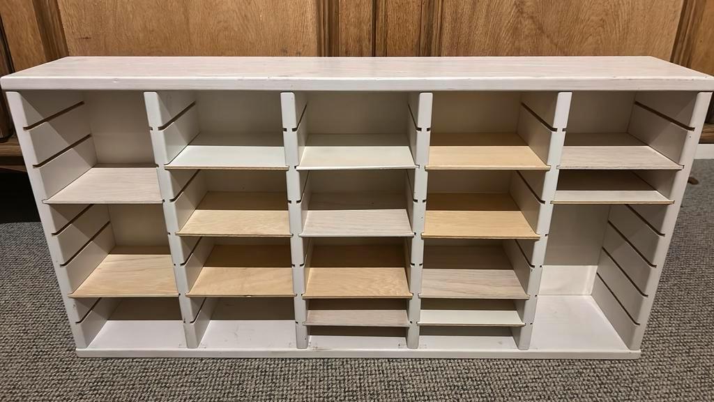 Gratis op te halen opbergkast voor cd’s 77cm breed en 38cm hoog formaat van vakjes is te wijzigen door plankjes te verplaatsen