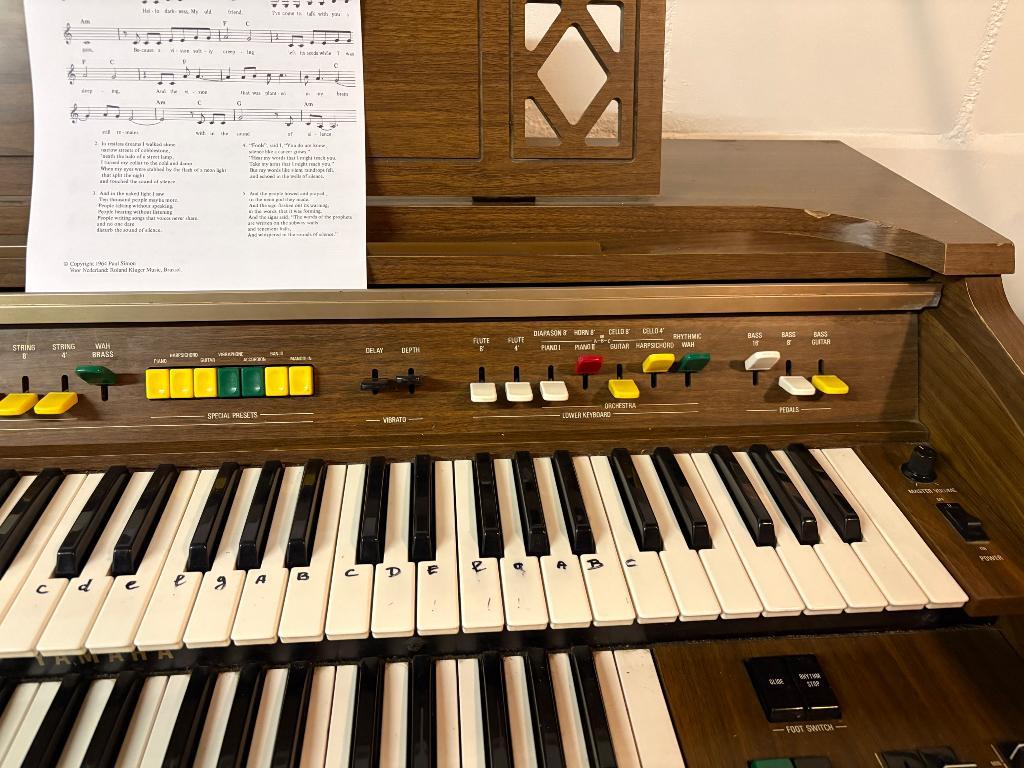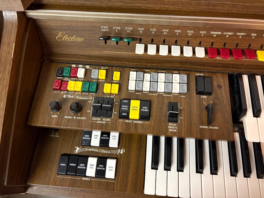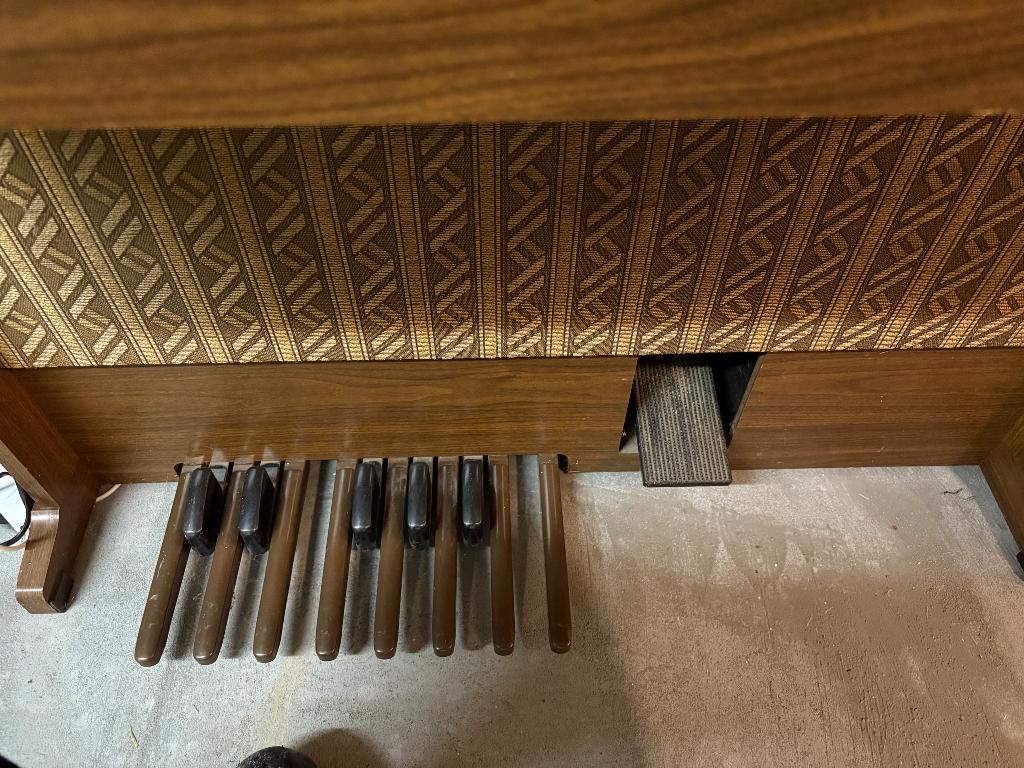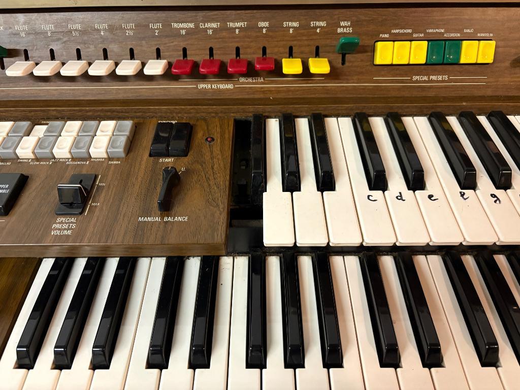 Voor de liefhebber, goed werkend electronisch orgel uit de oude tijd. Nostalgische klanken met percussie en voetpedalen. Om te spelen, te jammen of voor onderdelen. 1 Toets (lage f op bovenklavier) on