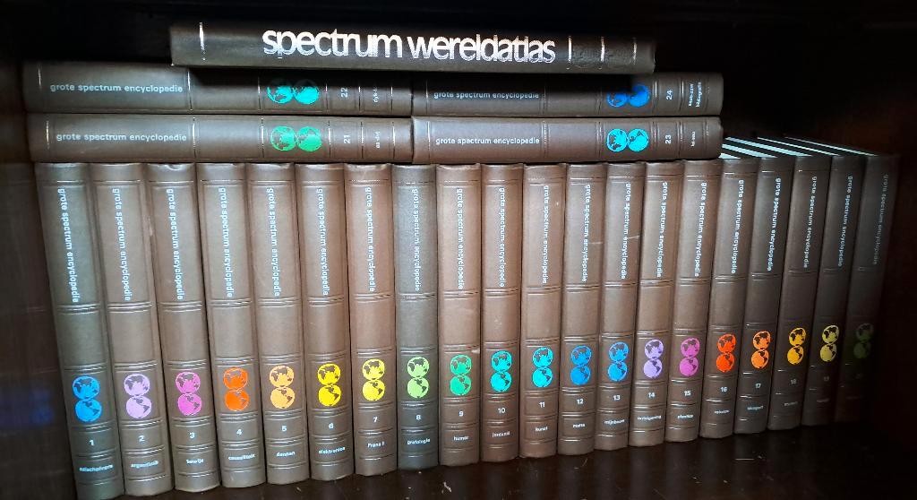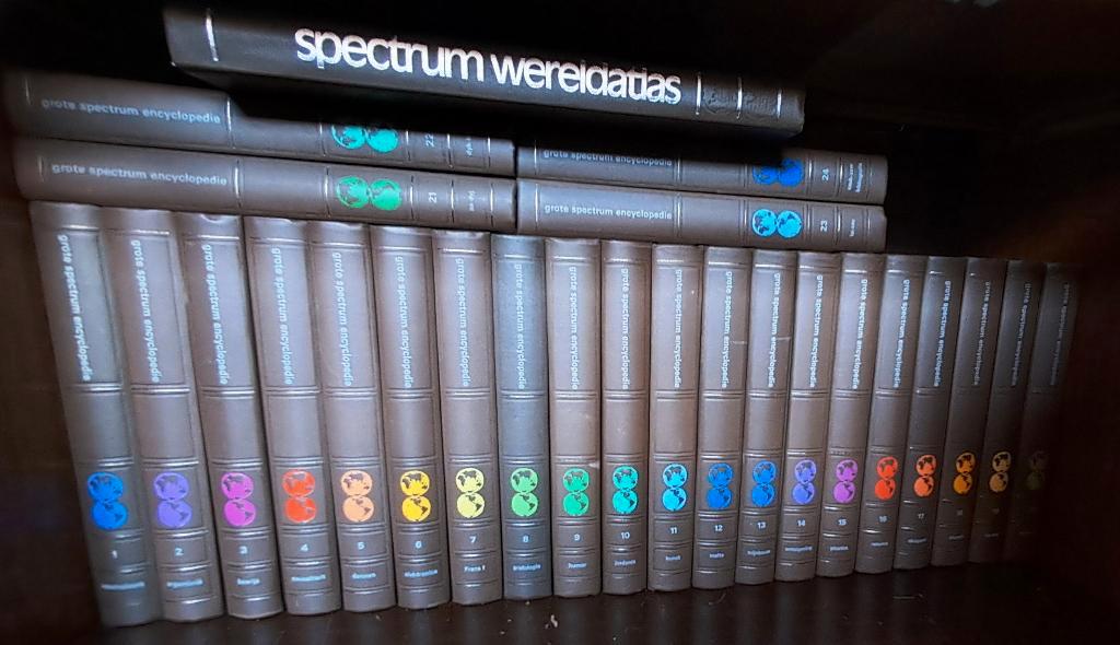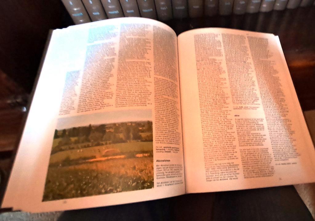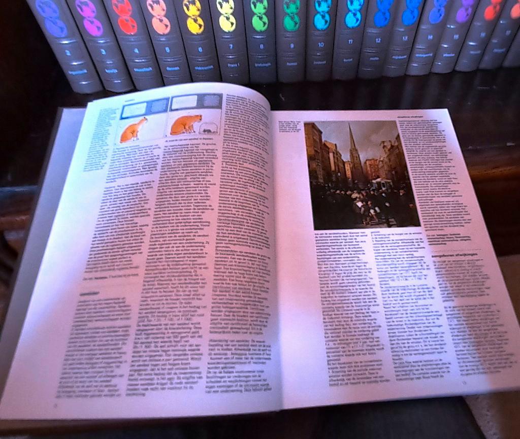 Zware gebonden boeken met veel illustraties, tekeningen en kaarten. 24 Delen en atlas. Uitgave 1983. Hele mooie staat. Maat per boek: 22,5 x 4 x 30,2 cm, samen 1 meter aan boeken. In deze encyclopedie