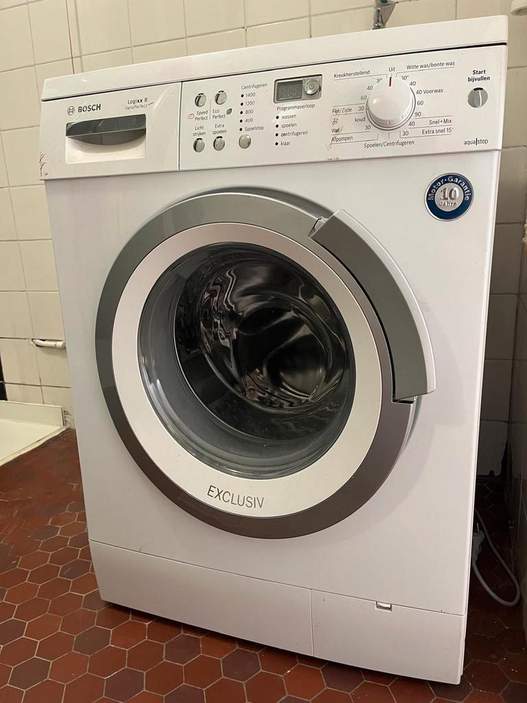Bosch logixx 8 varioperfect wasmachine in nette conditie met zichtbare gebruikssporen. De wasmachine werkt perfect, maar het deurslot is waarschijnlijk kapot. Dit is een kleine reparatie van ongeveer