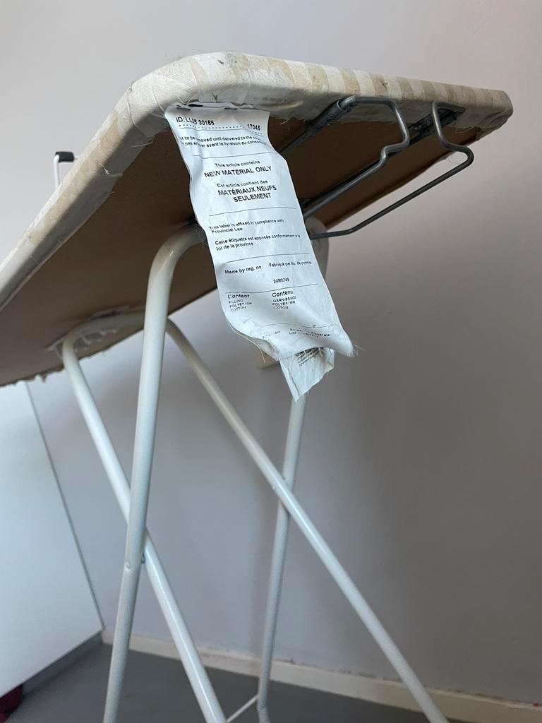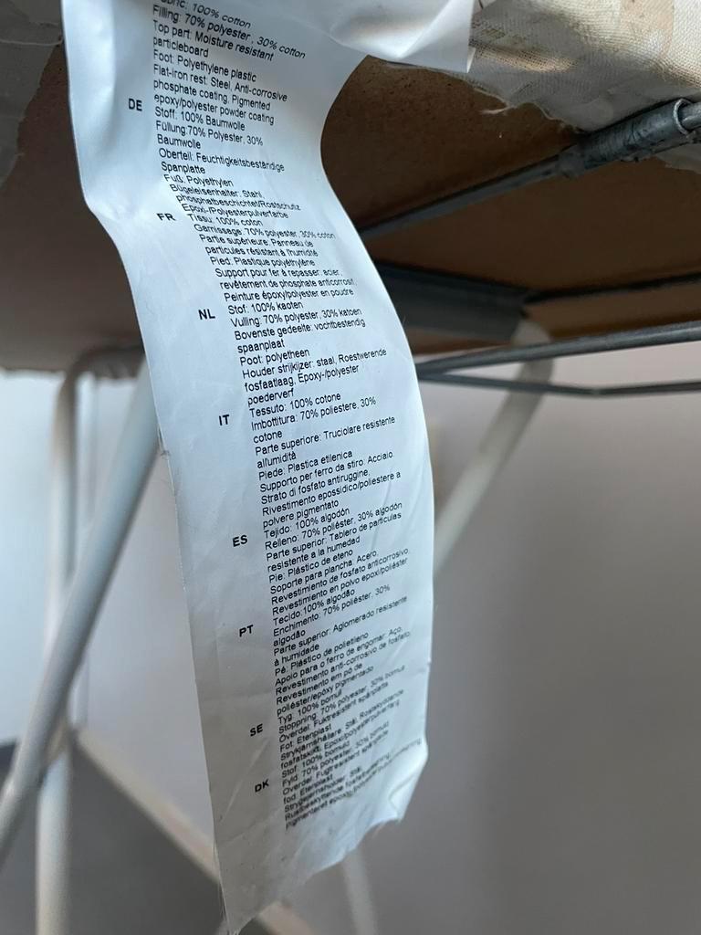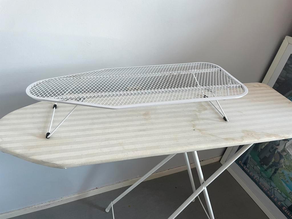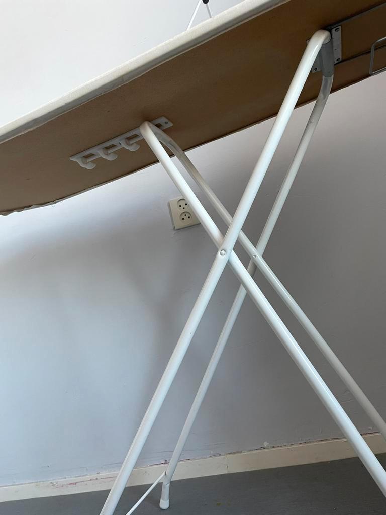Robuuste witte strijkplank met gebruikssporen maar met een nieuwe hoes zie je daar niks van. Super handig en verstelbaar in 4 verschillende hoogtes. Komt met een rekje dat er denk ik bijhoort. Wordt n