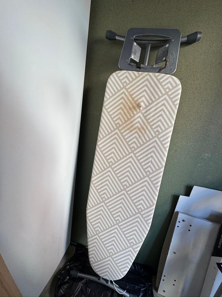 Deze strijkplank is inklapbaar en makkelijk op te bergen. Er zijn wat gebruikssporen op de kleding.