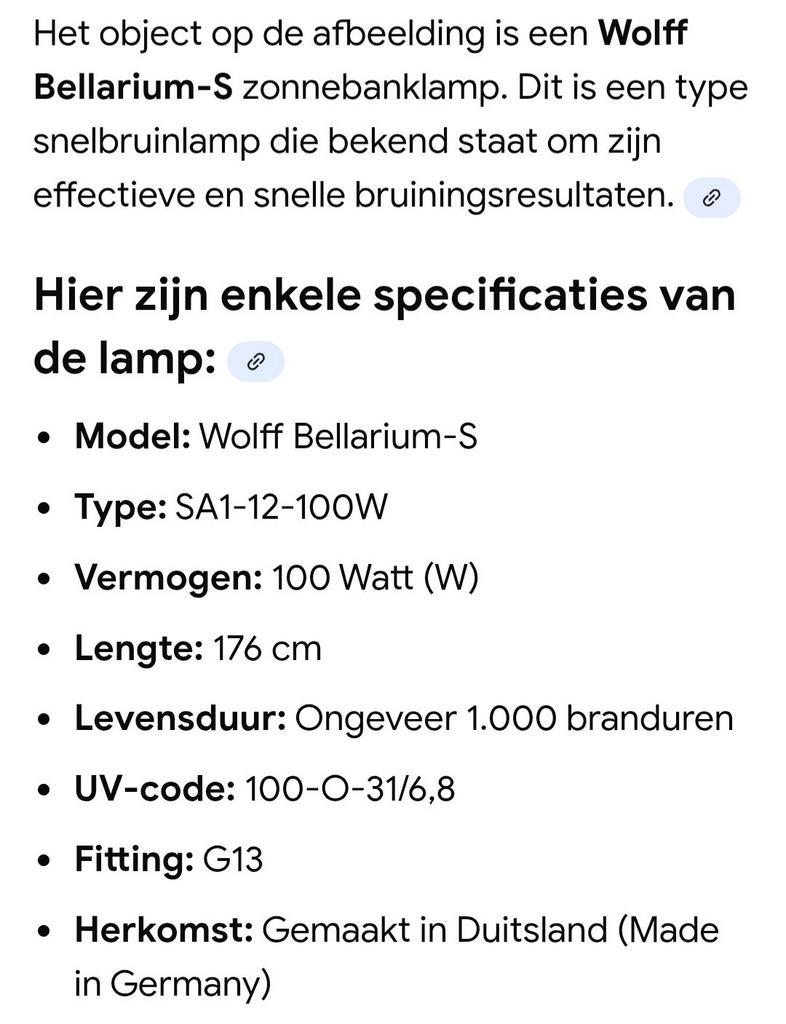 Ik heb er hiervan 10 stuks. Amper gebruikt. Wolff bellarium-s zonnebanklamp, type sa1-12-100w. Deze snelbruinlamp staat bekend om zijn effectieve en snelle bruiningsresultaten. De lamp is 176 cm lang