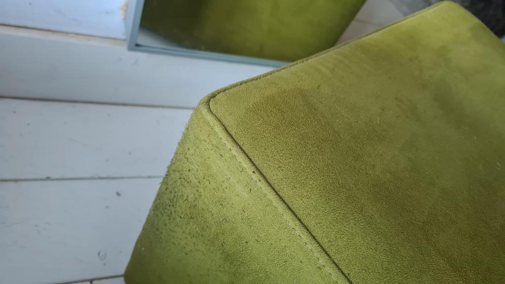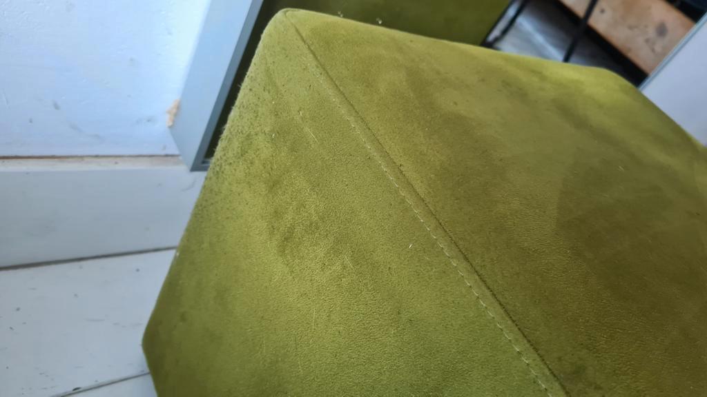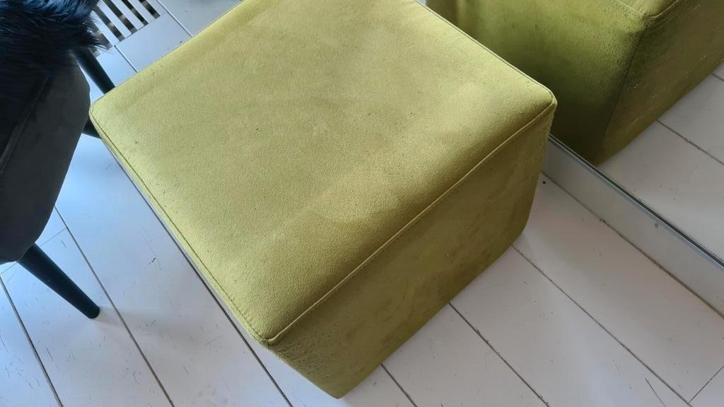 Groene poef. 46 X 46 x 41 appeltjesgroen. Suède of suèdine!? Gratis ophalen. Katten hebben er aan gekrabt! Paar kanten nog best oké!