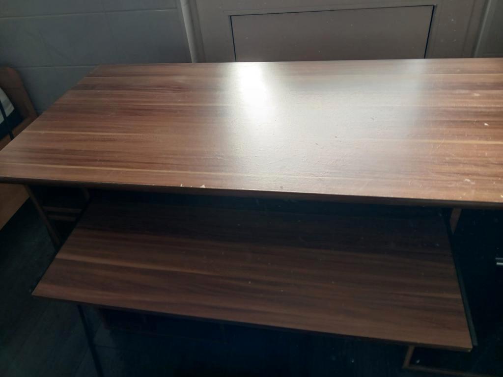 Gebruikt bureau met afmetingen 142x60 cm en een hoogte van 75 cm. Het bureau heeft ruimte voor een computerkast en een uitschuifbare toetsenbordplank. Er zijn gebruikssporen aanwezig.