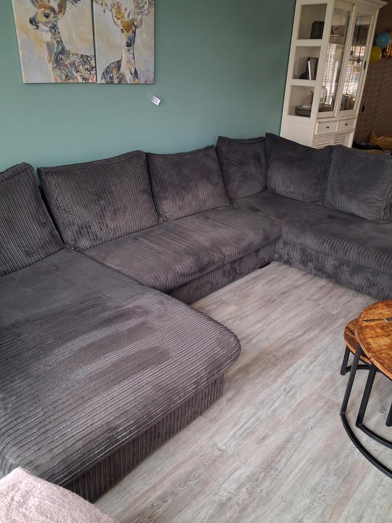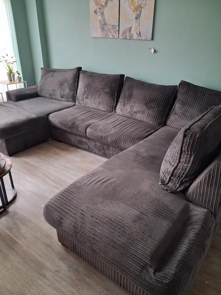 Gratis af te halen grote u-bank bekleed met ribstof. De bank heeft gebruikerssporen, maar is nog steeds comfortabel en functioneel. Ideaal voor een groot gezin of als je graag veel ruimte hebt om te z
