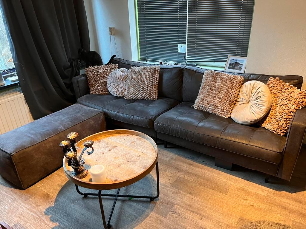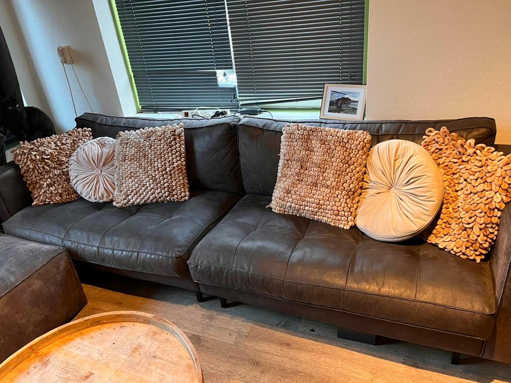 Mooie bank, donker antraciet, zit erg lekker en de kussens zijn nog steeds stevig, ongeveer 4 jaar gebruikt. Sierkussens op foto niet inbegrepen.