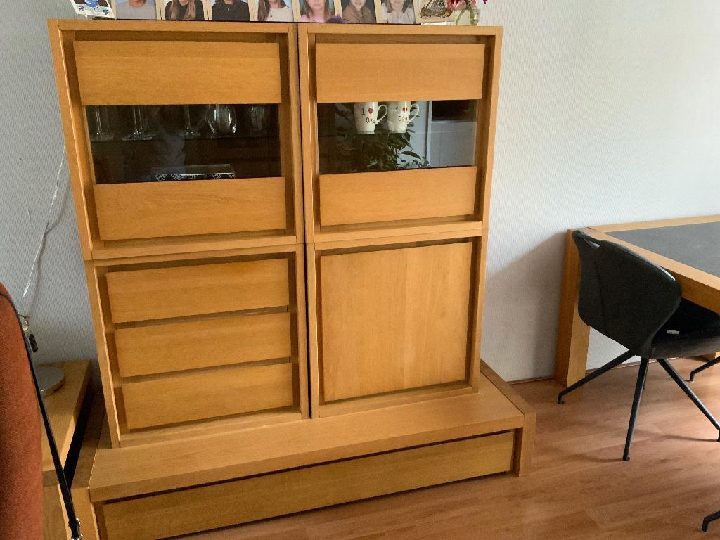 Het meubel bestaat uit 5 losse onderdelen. Het onderste gedeelte is het grootst en heeft een lade. Ik heb het breedste gedeelte aangehouden voor de maat. Breedte 155 cm, hoogte 158 cm, diepte 62 cm. K