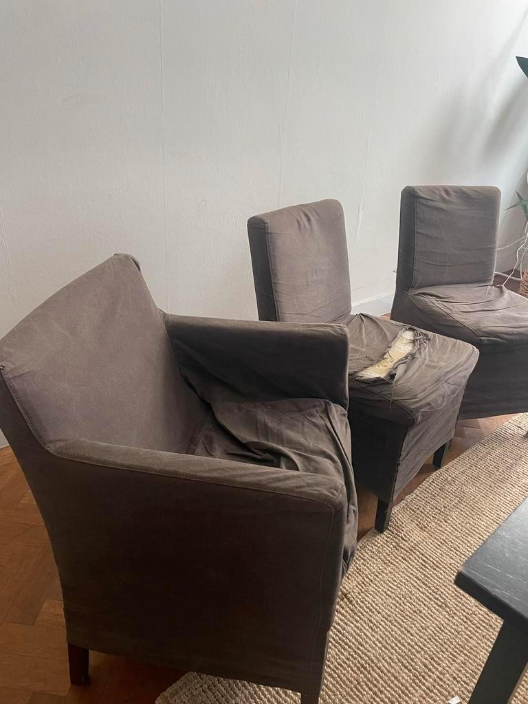 Zes stoelen waarvan vier zonder armleuning en twee met. Stoelen zijn gebruikt en meerdere hoezen zijn beschadigd of gescheurd. De bruine/taupekleurige hoezen zijn afneembaar en kunnen in de wasmachine